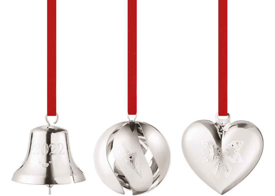 The Christmas Collectibles set of 2022 includes the striking ball, bell and heart ornaments. Carefully plated in palladium, the silver-toned pieces come with two coloured ribbons, a special off-white and a classic red one. The decorations make for stunning ornaments to hang on the tree and beyond.