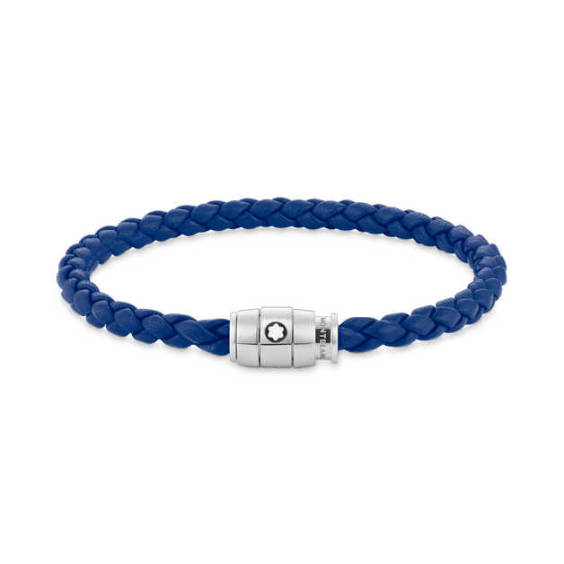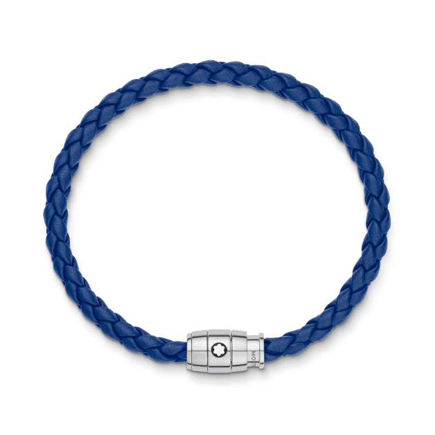 The piece, woven from blue leather, has a polished stainless steel clasp and a single steel ring with the Montblanc logo. Size 60.