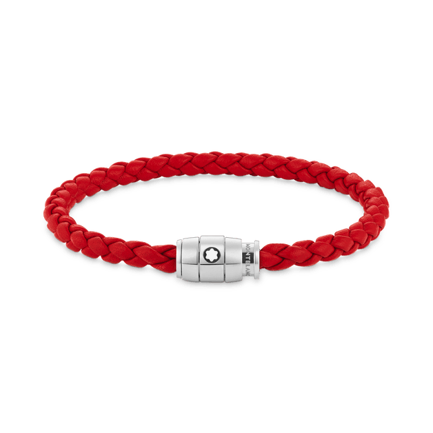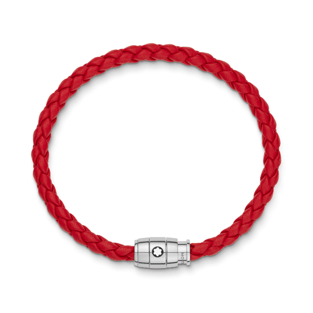 The jewelry, woven from red leather, has a polished stainless steel clasp and one steel ring with the Montblanc emblem. Size 63.