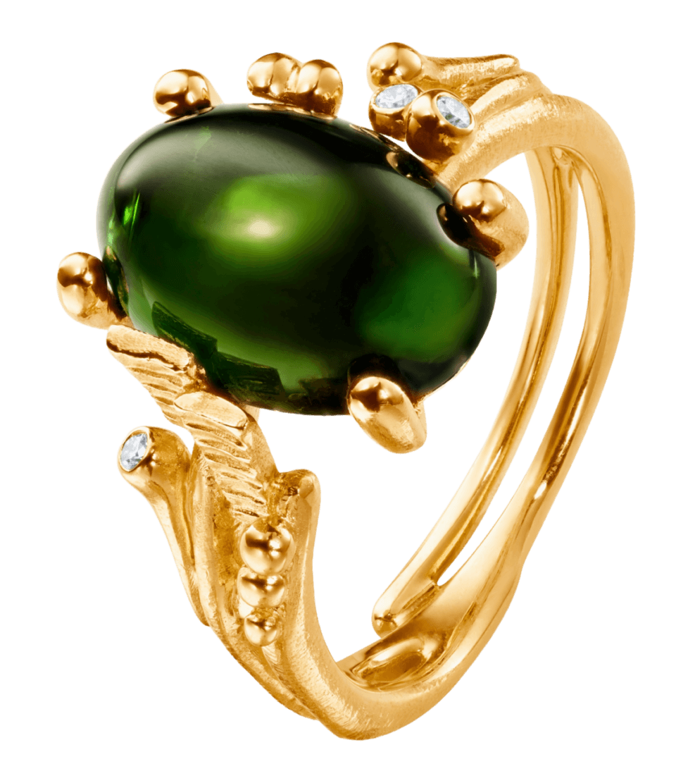 Designed by Charlotte Lynggaard, the BoHo ring small is crafted from 18 karat yellow gold with a 9×13 mm green tourmaline, and 3 hand-set diamonds totalling 0.02 carat TW. VS. The hammered and polished gold surfaces are hand-finished by master goldsmiths. Part of the BoHo Collection.