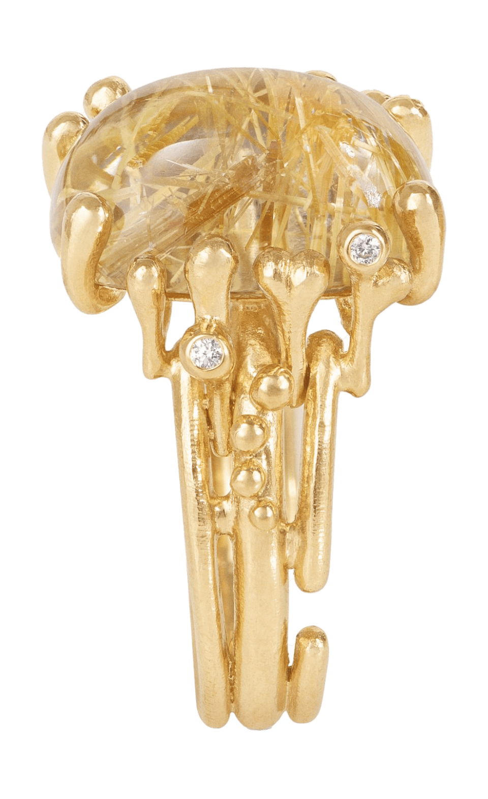 Designed by Charlotte Lynggaard, the BoHo ring medium is crafted from 18 karat yellow gold with an 8,3 carat, 15×11 mm rutile quartz and 5 hand-set diamonds 0,04 carat TW.VS. The hammered and polished gold surfaces are hand-finished by master goldsmiths. Part of the BoHo Collection.