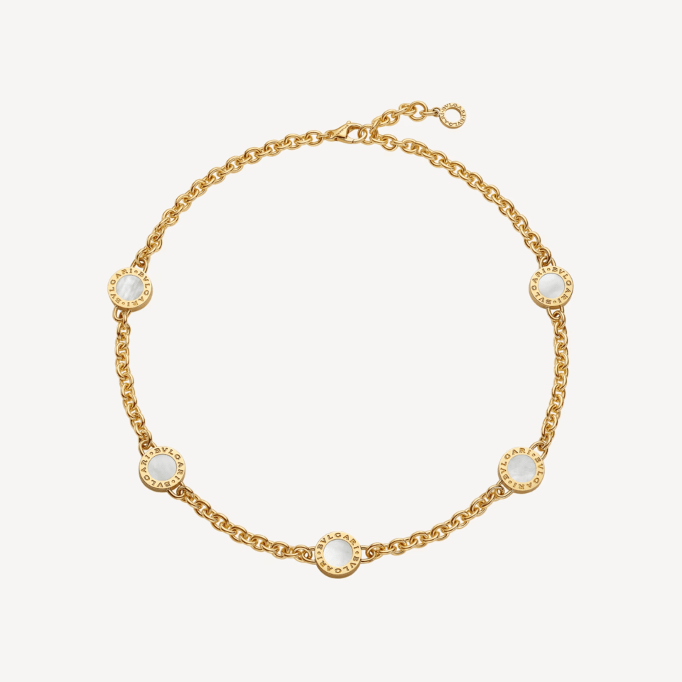 Inspired by the Maison’s Roman roots and created as a timeless fusion of culture and modernity, the Bvlgari Bvlgari necklace in 18 kt yellow gold showcases the collection’s original boldness. Evoking the curved inscriptions on ancient Roman coins, the distinctive circular design element is set with mother-of-pearl and onyx, which can be flipped at will, and inserted into a thick gold chain.