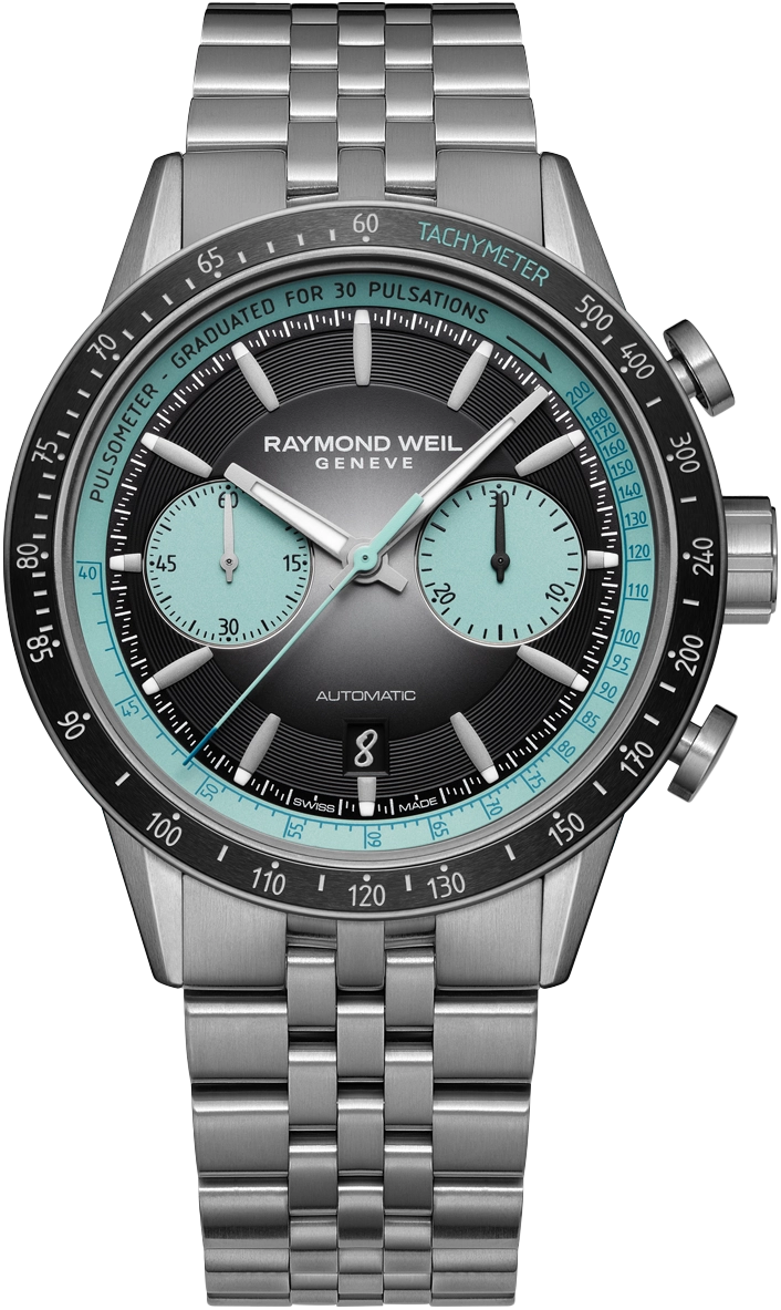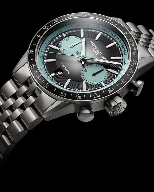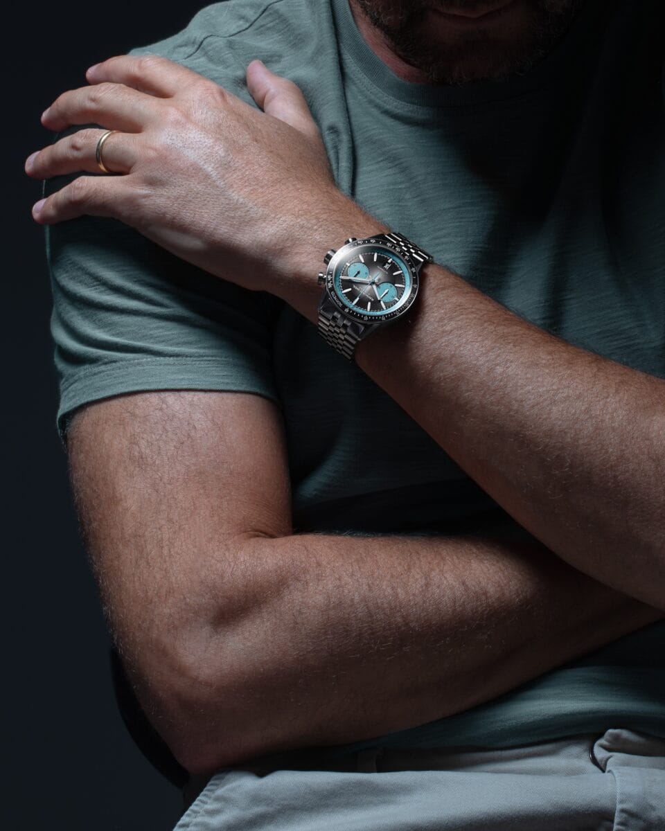 This dial wonderfully plays with colour, depths and textures, creating a subtle, sophisticated appearance. The chronograph seconds hand, counters and the pulsometer scale are all presented in shades of turquoise. A date display is positioned at 6 o’clock with a black date disc, matching the colour of the dial. The tachymeter scale, presented on the bezel, provides the means to determine the speed of a vehicle over a known distance and the pulsometer scale allows the wearer to determine the heart rate of an individual.