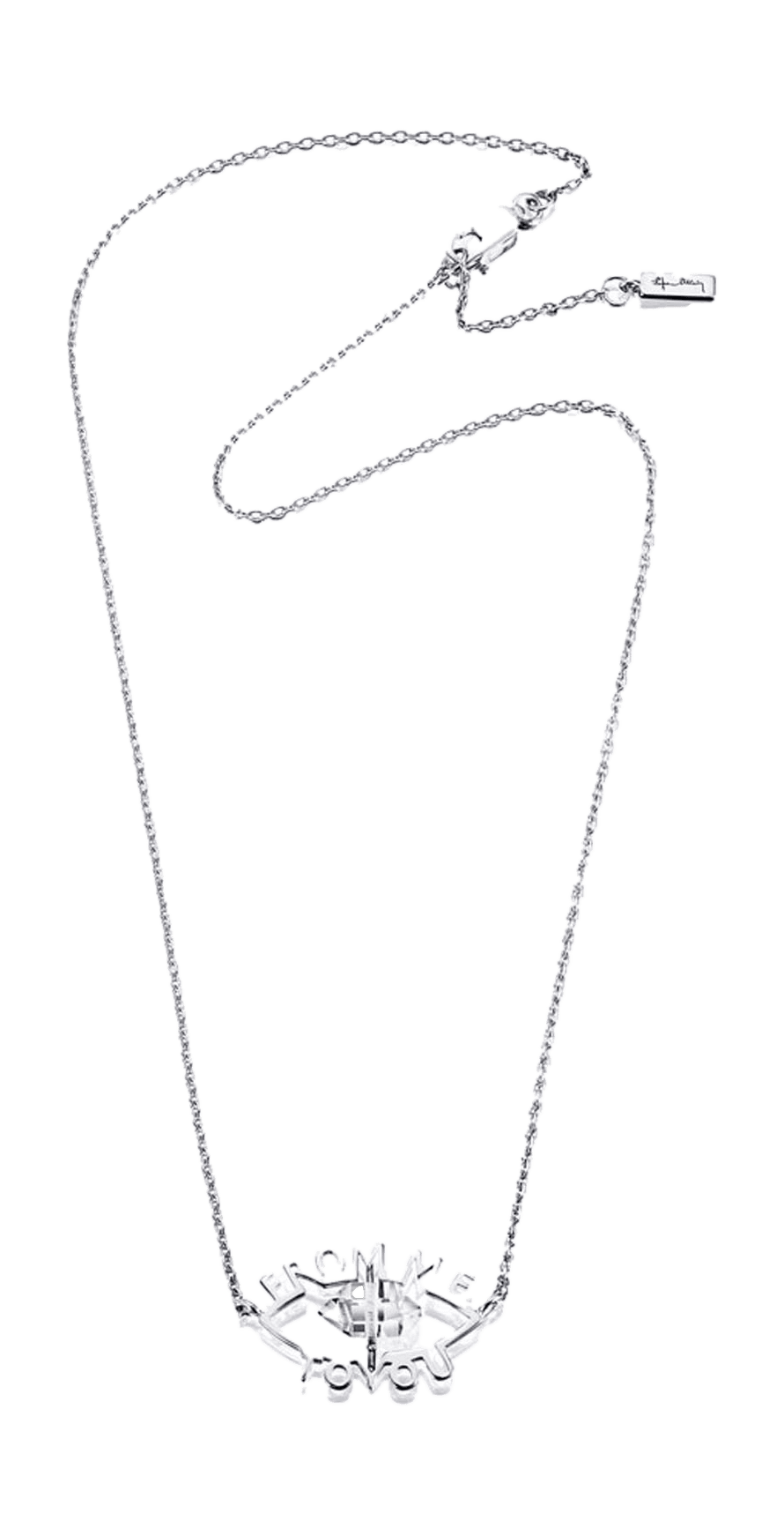 A tribute to The Beatles. Necklace in sterling silver with the text From Me To You. A Herkimer diamond is set in the middle. Pendant: 23 x 15 mm Adjustable size: 42 – 45 cm