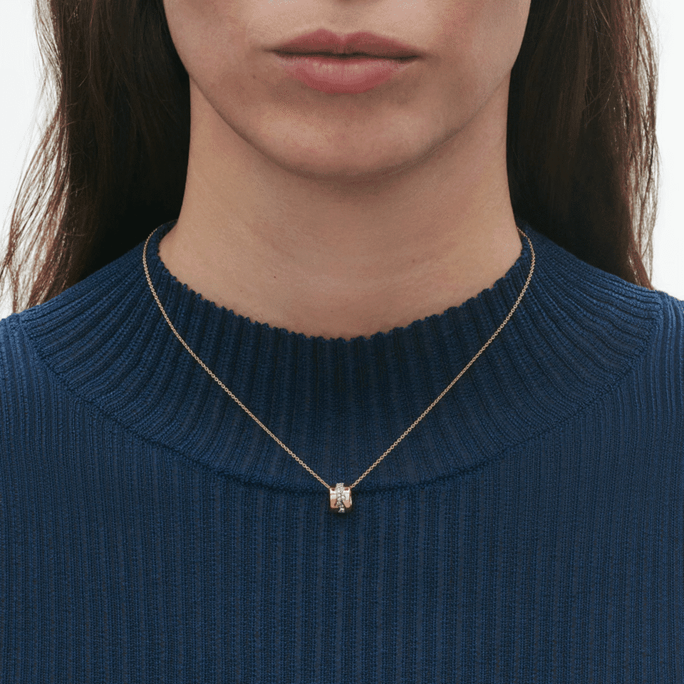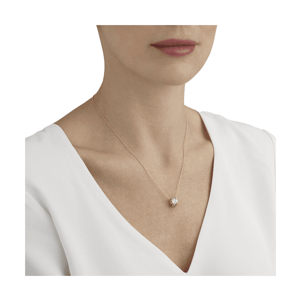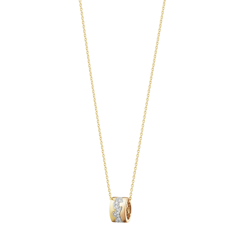 Crafted from 18 kt. rose, yellow and white gold with 0.19 ct. pavé diamonds, the pendant is suspended from a simple yellow gold chain.