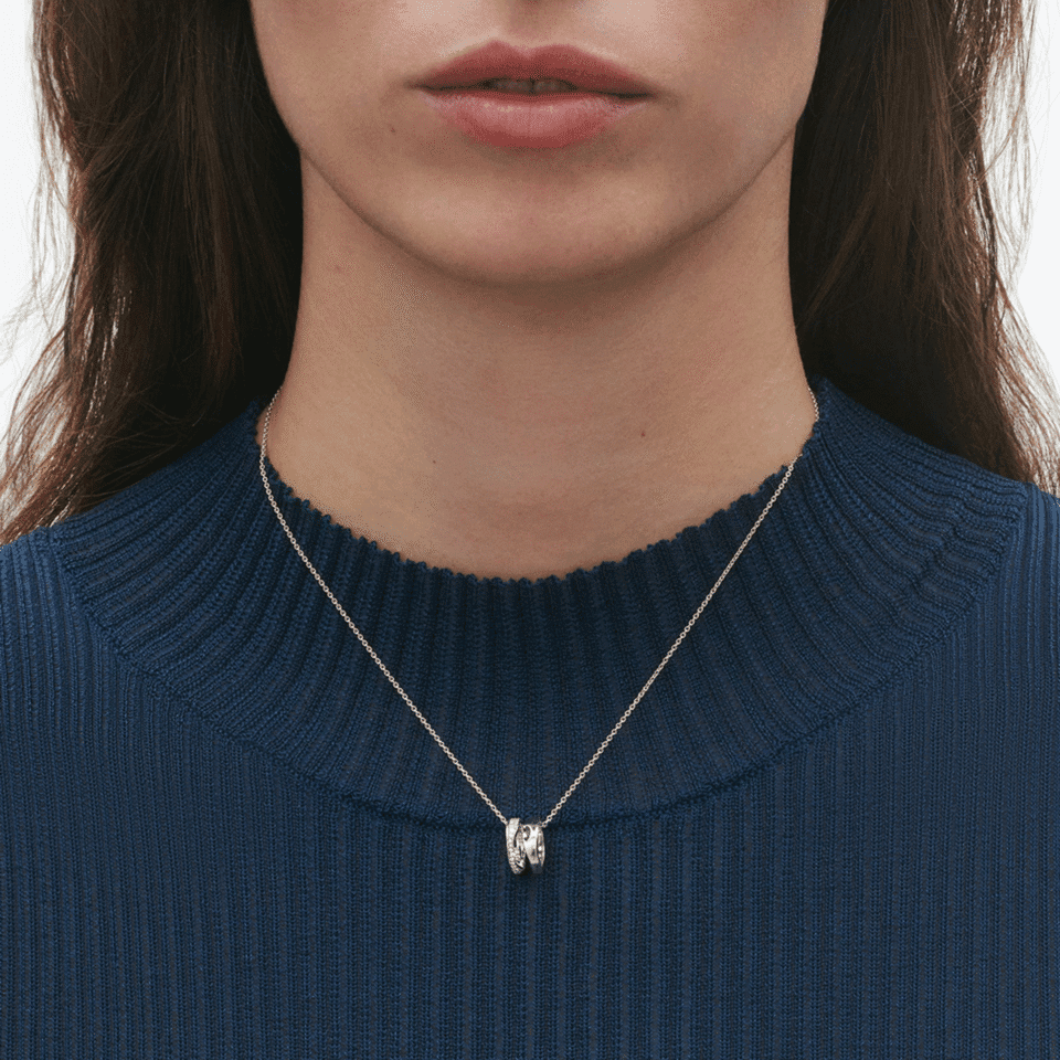 The pendant features two 18 kt. white gold rings, one of which is pavéed with 0.22 ct. diamonds which hang together from a fine white gold chain.