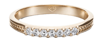 This ring is adorned with a sophisticated cord pattern that originates in a 4th century ring found in Uskela, Southwest Finland. Golden items are rare amongst prehistoric findings in Finland but not entirely unusual. The oldest golden items found their way to the area of present-day Finland in the early centuries of the C.E. also known as the Roman Iron Age. This ancient ring has retained its golden gleam for nearly two millennia. It was made to be everlasting. The Heritage ring is adorned with seven beautifully cut 0,02 ct diamonds set in a row, sparkling like shards of stars fallen from the night sky. Of even width, the Heritage ring is easy to combine with other Kalevala Love rings. The symbol of the Kalevala Love collection, a heart based on a Viking Age motif, is engraved on the inside of the shank.