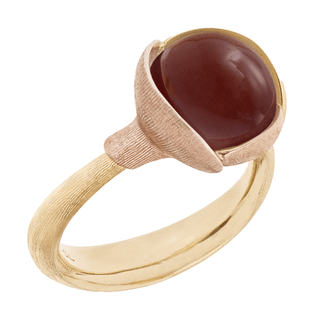 Designed by Charlotte Lynggaard, the Lotus ring, size 2, is crafted from 18 karat yellow and rose gold with a carnelian cabochon. Handcrafted by master goldsmiths, the visible gold surfaces are hand-satinised, whilst the inside of the ring has a polished finish. Part of the Lotus Collection. Please note: As gemstones are natural materials, each stone is absolutely unique. They will vary in colour and have individual, unique inclusions and features. Web-images of stones are only representatives of the unique stone you will receive when ordering the product, not the exact stone.
