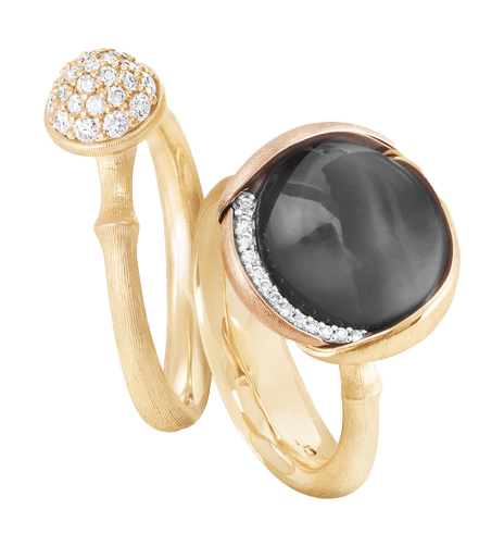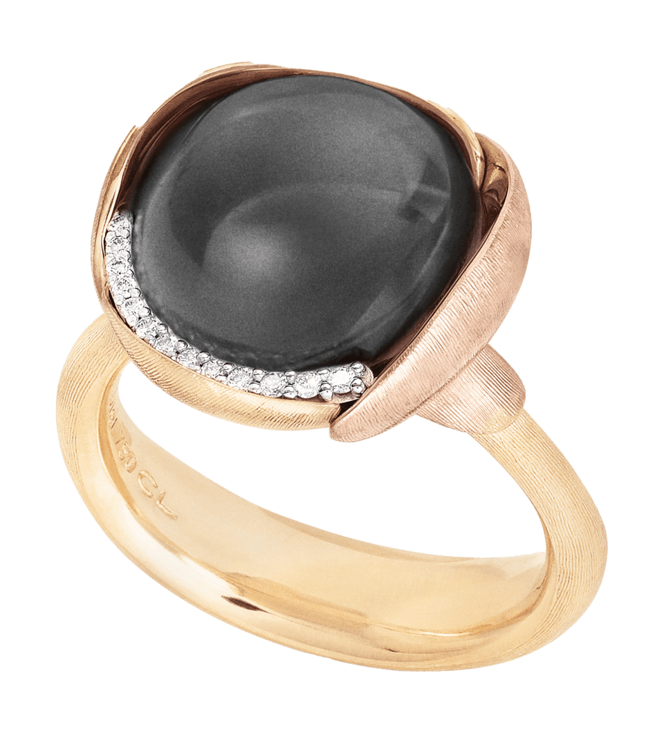 Ring Lotus size 3 – 18 karat yellow gold – leaves rose gold grey moon stone cabochon 13 diam. total 0,05 ct. TW.VS.