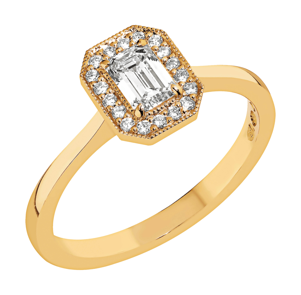 The center stone of the yellow gold Kukkaniitty M-683K ring shines with an emerald cut 0.30–0.34ct diamond.