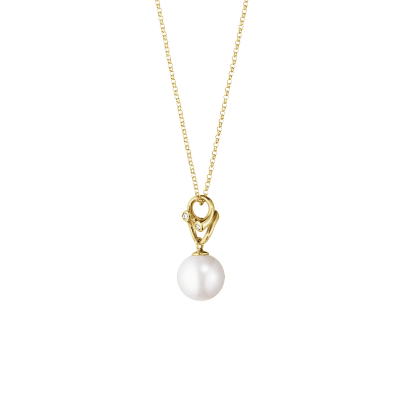 Bringing a fresh new twist to the classic jewellery elements of yellow gold, diamonds and pearls, this beautifully crafted pendant has a relaxed attitude that is the ultimate in Scandinavian cool. Organically shaped strands of gold twist together, holding diamonds like tiny flower buds and forming the mount for a single white pearl. Worn with jeans and a t-shirt during the day or with a dress in the evening, it is a necklace that will be loved by any woman who enjoys true understated luxury.