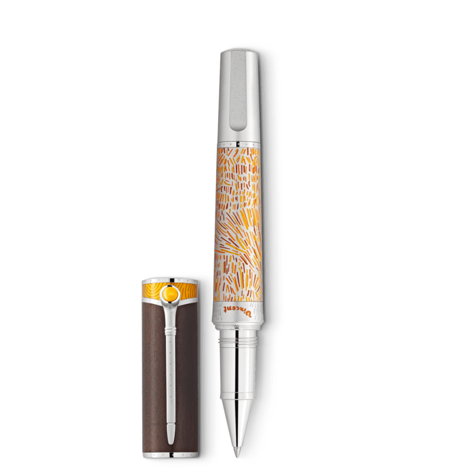 The engraved 1888 on the barrel ring – next to Vincent’s signature in bright orange – commemorates the year when he moved to Arles. While the barrel is decorated in shades of yellow and orange reflecting the sun-drenched landscapes of southern France, the famous series of five sunflower paintings inspired the interpretation embossed on the handcrafted Au 750 solid gold, rhodium-coated nib. Van Gogh developed a looser, freer style and becoming equally competent with brush and palette knife – which he used for chunky, impetuous “impasto” work.
