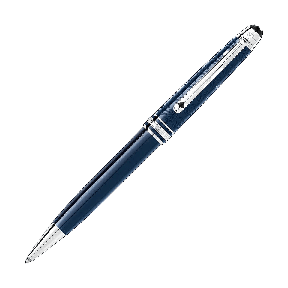 The Meisterstück Around the World in 80 Days collection is inspired by the famous adventure novel by Jules Vernes. The Classique Ballpoint Pen in blue precious resin draws on the first part of the journey. The main character travels, mainly via steamboat, from London to Bombay, crossing the Mediterranean ocean and through the Suez canal. The cap features a milled pattern of the key elements of the novel: ocean waves, card suits and a cartouche with a lasered steam boat. The cap top is embossed with the length of the journey, 18 days from London to Bombay and 80 days in total.
