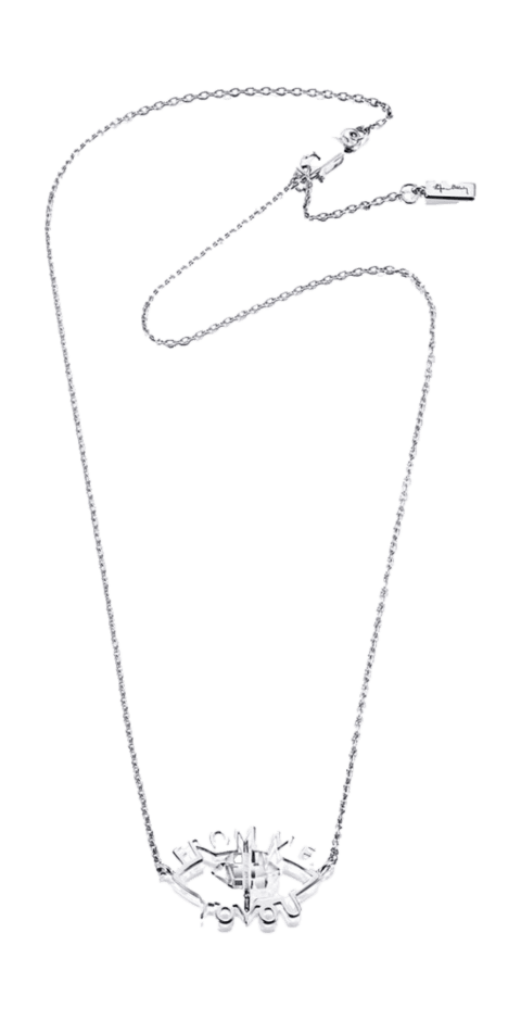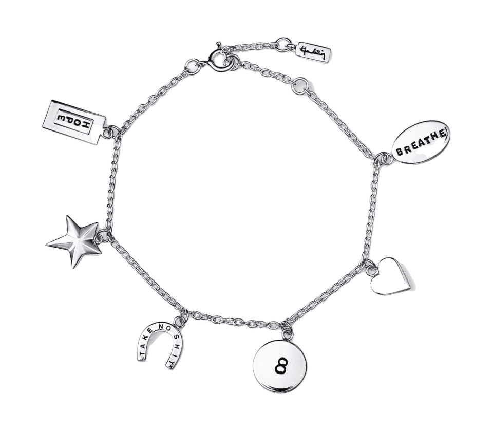 Bracelet in recycled sterling silver with six pieces of charms inspired by other collections by Efva. The charms consist of a heart, Baby luck- a plate with an 8, Take no shit- a horseshoe with the text “Take no shit”, Catch a falling star – a star, Hope- a stamped plate with the word “Hope” and Breathe- an oval plate stamped with “Breath”.