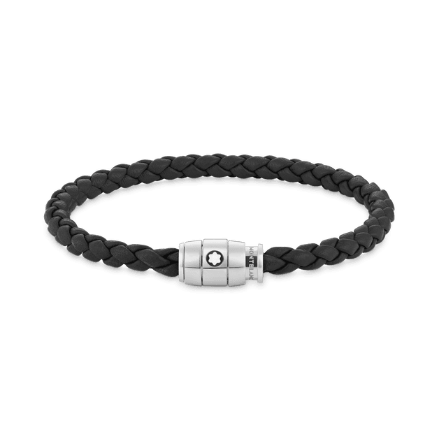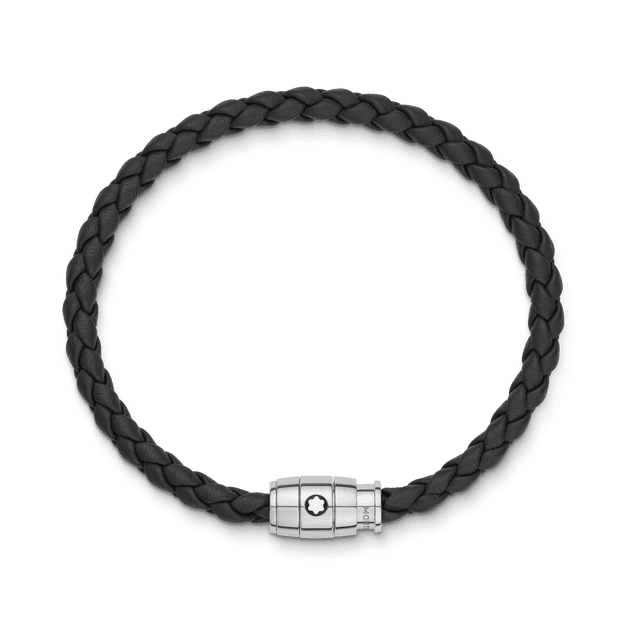 The piece of jewellery, woven from black leather, has a clasp made of polished stainless steel with one ring in steel with Montblanc emblem. Size 60.