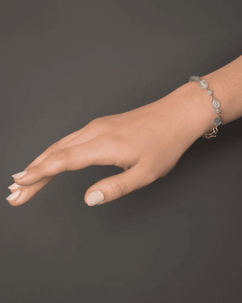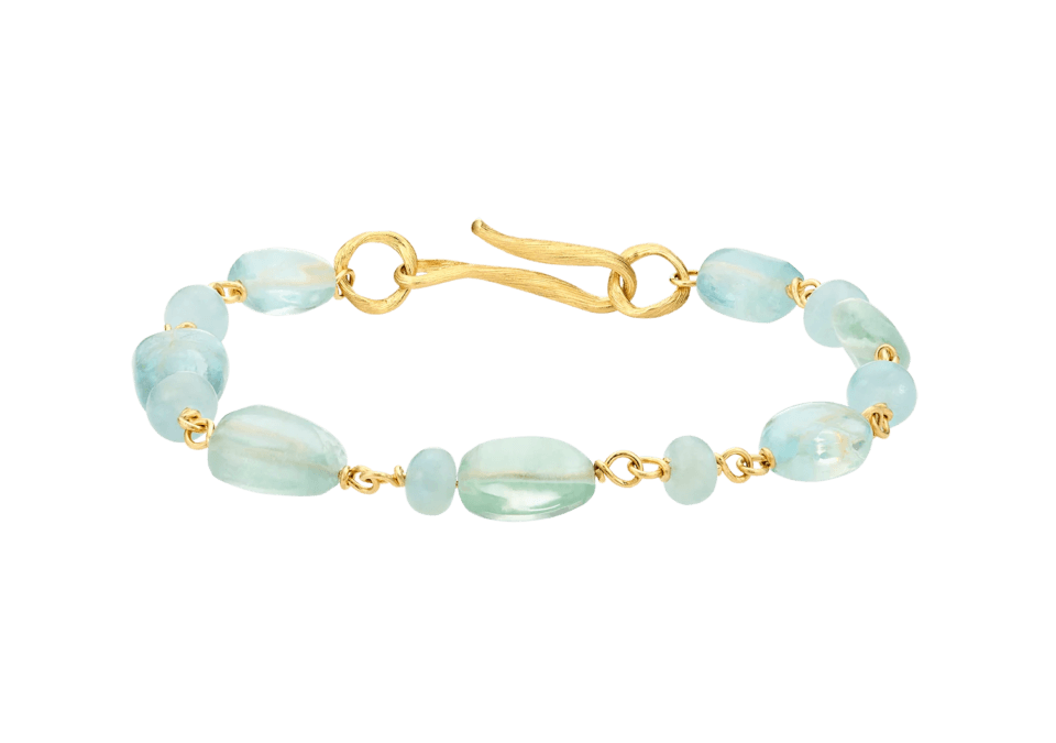 Piccolo Breeze 18K gold bracelet features a seamless sequence of aquamarine gemstones, each chosen for its crystalline purity and light-reflecting character. Inspired by the infinite, calm blue tones where the sea meets the sky.