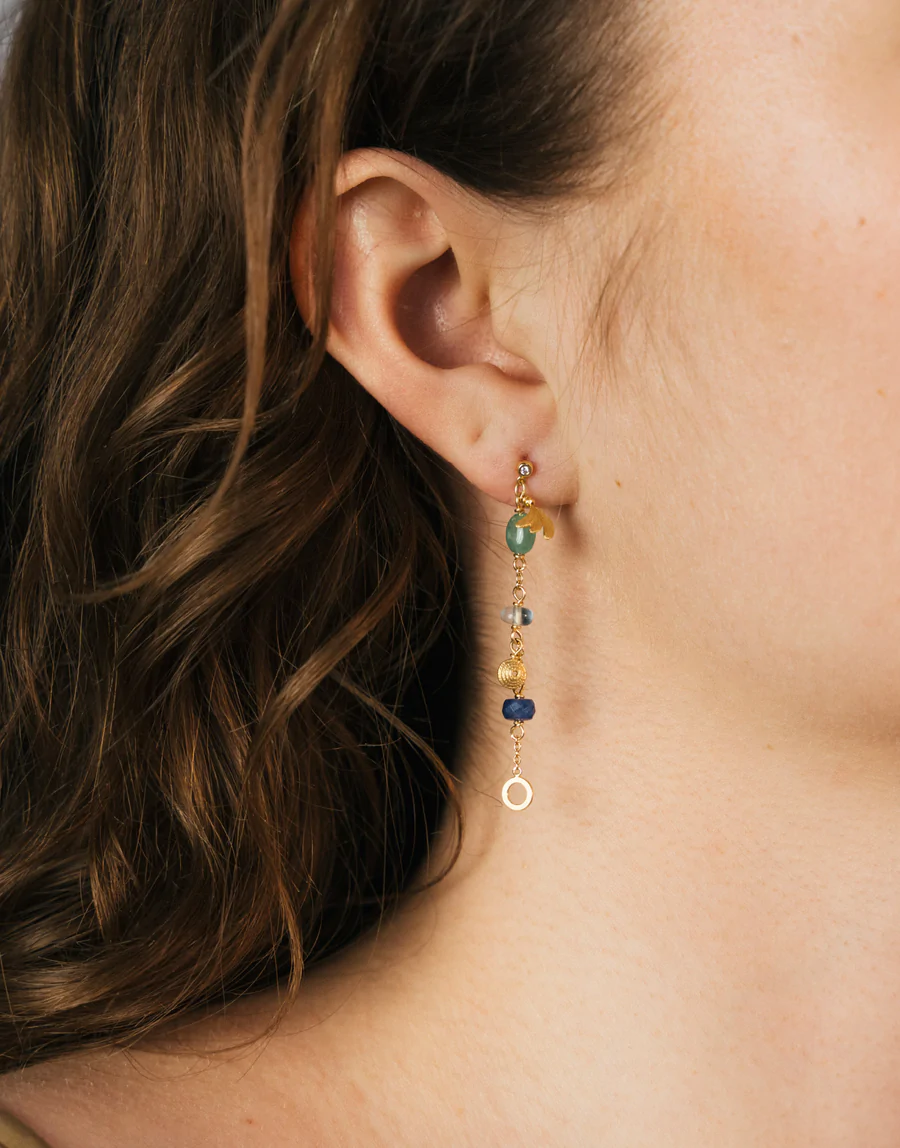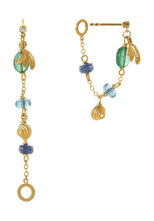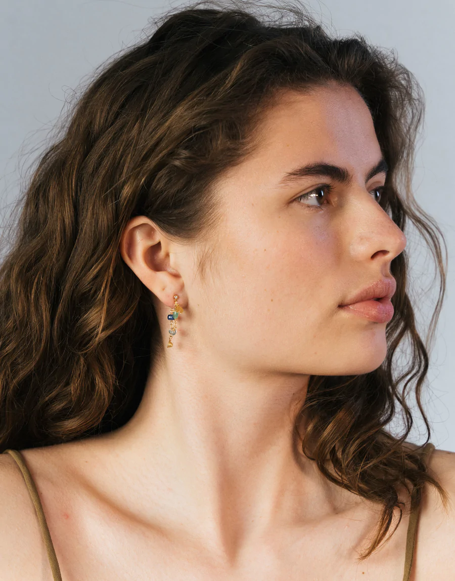 Piccolo Sea Breeze earrings are composed of small, exquisite Aura and Thera pendants in precious metal, as well as emerald, aquamarine and blue sapphire. This enchanting colour composition is inspired by the freshness and sea hues that we find along the coasts of Denmark.