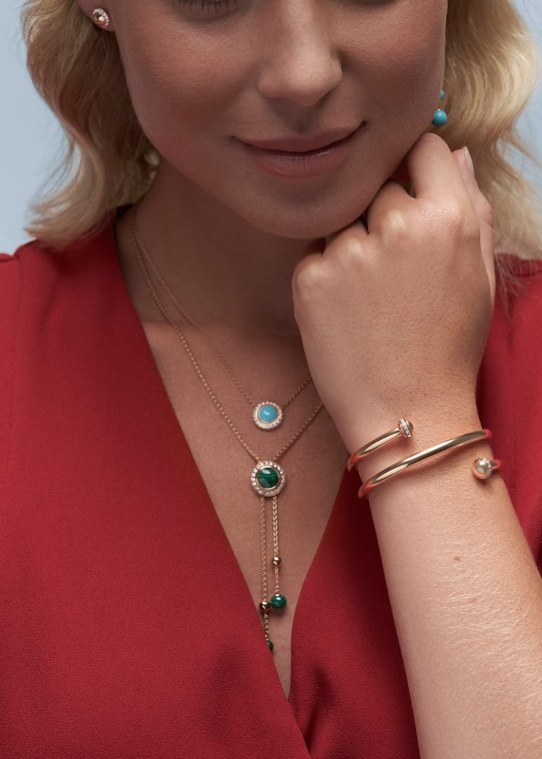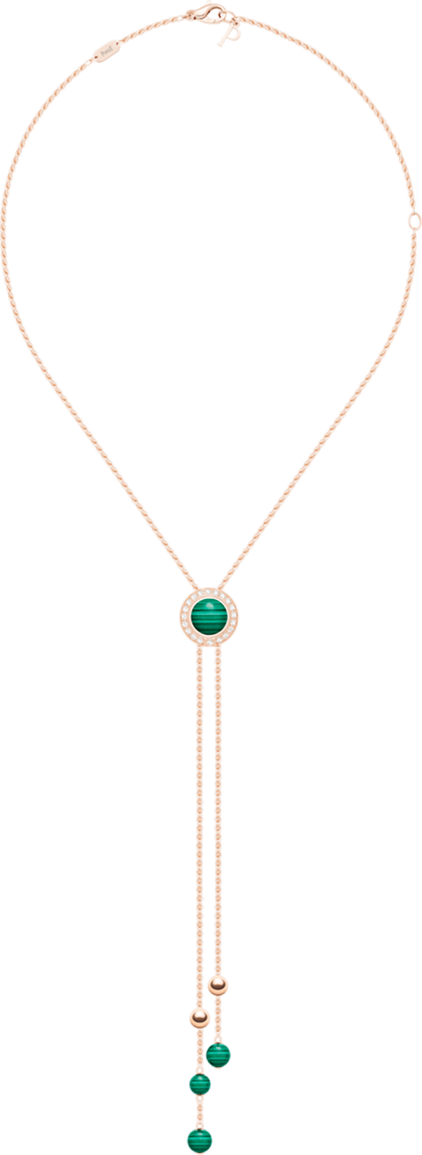 Possession pendant in 18K rose gold set with 20 brilliant-cut diamonds (approx. 0.35 ct) and decorated with 4 malachites (approx. 10.07 cts).