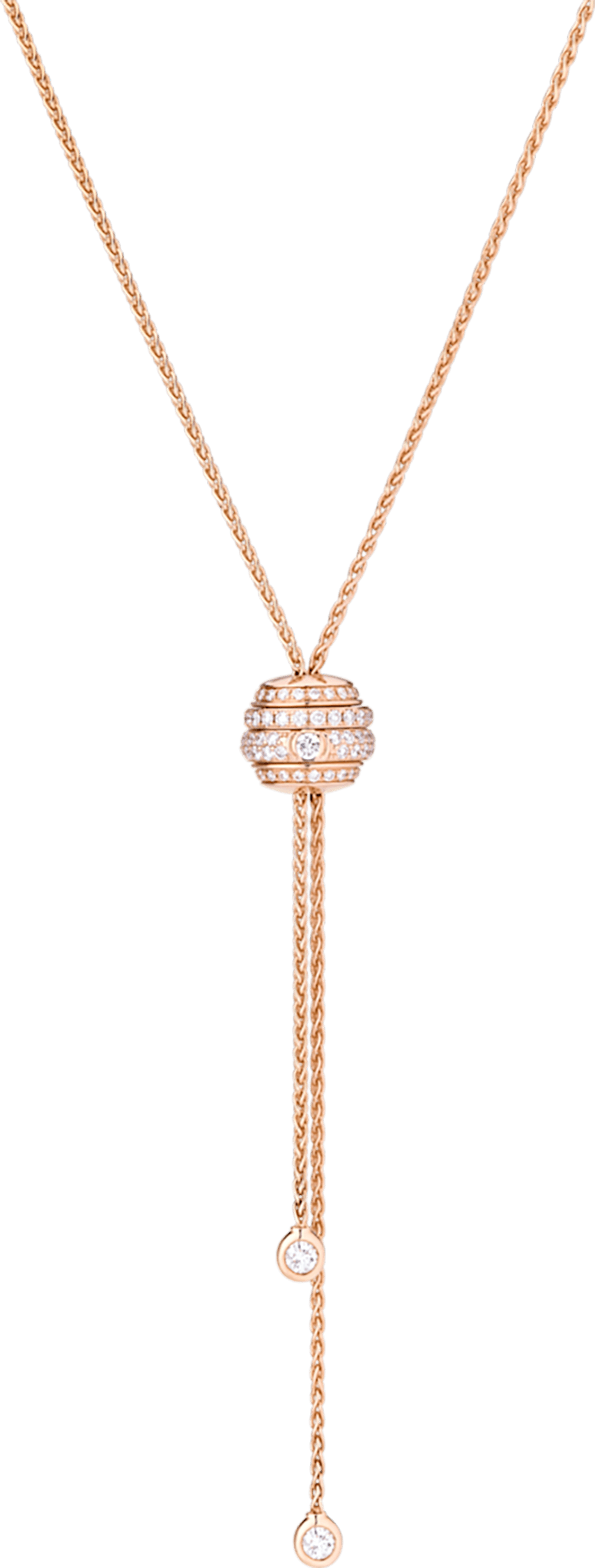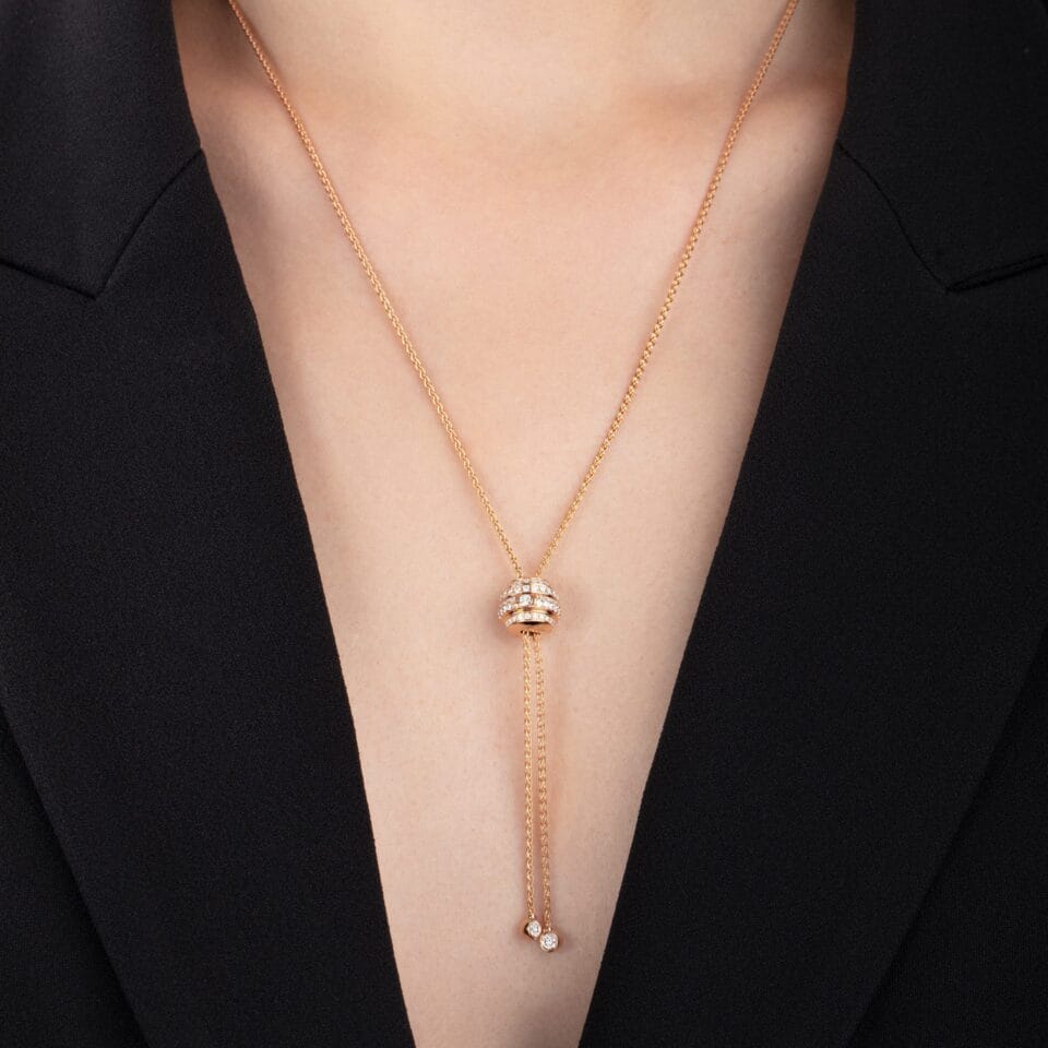 Sparkling with over one hundred diamonds, a voluptuous Possession miniature diamond ring slides up and down its rose gold chain to become a luxury diamond pendant, worn either long or short, symmetrically or asymmetrically. Rose gold bands set with a multitude of diamonds rotate side by side, while a brilliant-cut diamond in a half-moon setting dazzles in the center of the ring. As the wearer masters her own destiny with one turn of the ring, two brilliant-cut diamonds on the end of the necklace cascade down from the jewel, gracefully dancing with every move she confidently makes.
