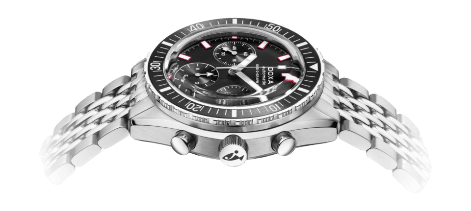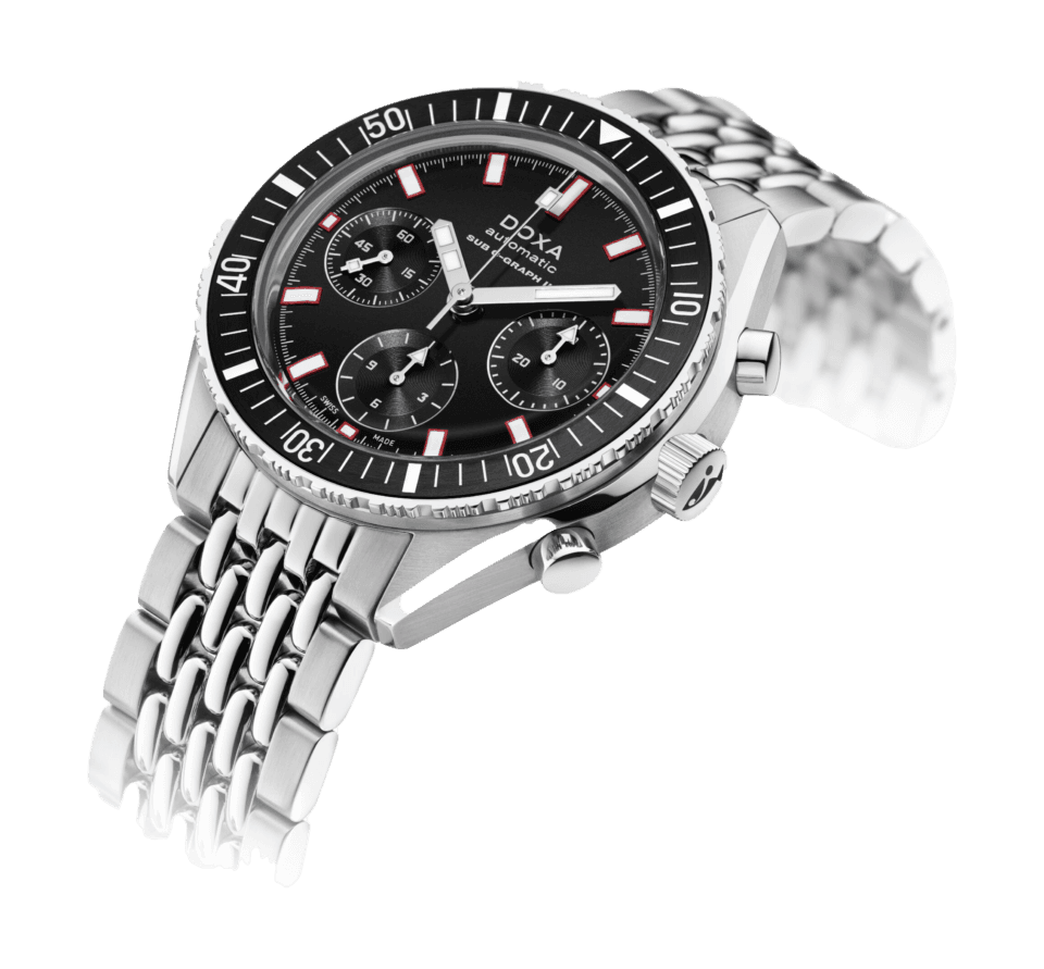 The mechanical automatic chronograph (28,800 vph, 4.0 Hz, 27 jewels) is a Tri-Compax model with three counters for keeping track of dive times and a unidirectional rotating steel bezel with the minute indication highlighted in white Super-Luminova™.