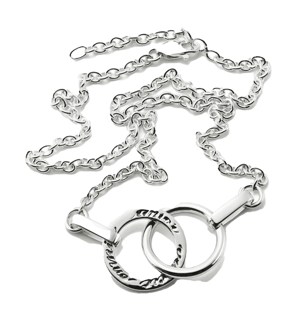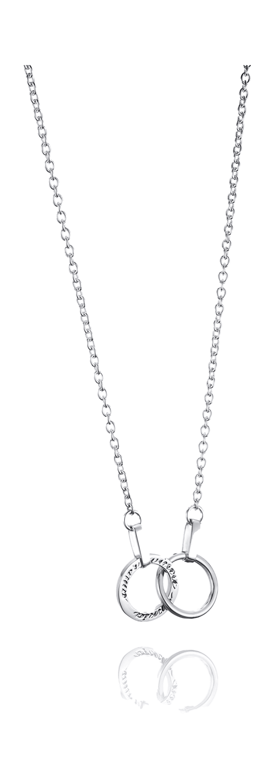 Necklace in recycled sterling silver with two rings linked together. One rounded ring and one squared with the words Amor Vincit Omnia – love conquers all in Latin.