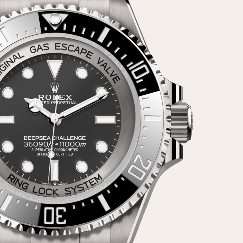 RLX titanium is a grade 5 titanium alloy selected by Rolex for its weightlessness and resistance to deformation and corrosion. Although insensitive to abyssal pressure, the experimental watch that accompanied James Cameron in the Mariana Trench still posed a wearability problem due to its weight, as it was made of 904L steel. The use of RLX titanium to create the case and bracelet of the Deepsea Challenge considerably lightened its weight: it is 30 per cent lighter than the experimental watch that inspired it. The watch also features a particularly visible grain in the satin finish on the bracelet and the case – with the exception of the crown guard. In order to highlight the curved profile of the lugs, the top edges have been chamfered and polished.
