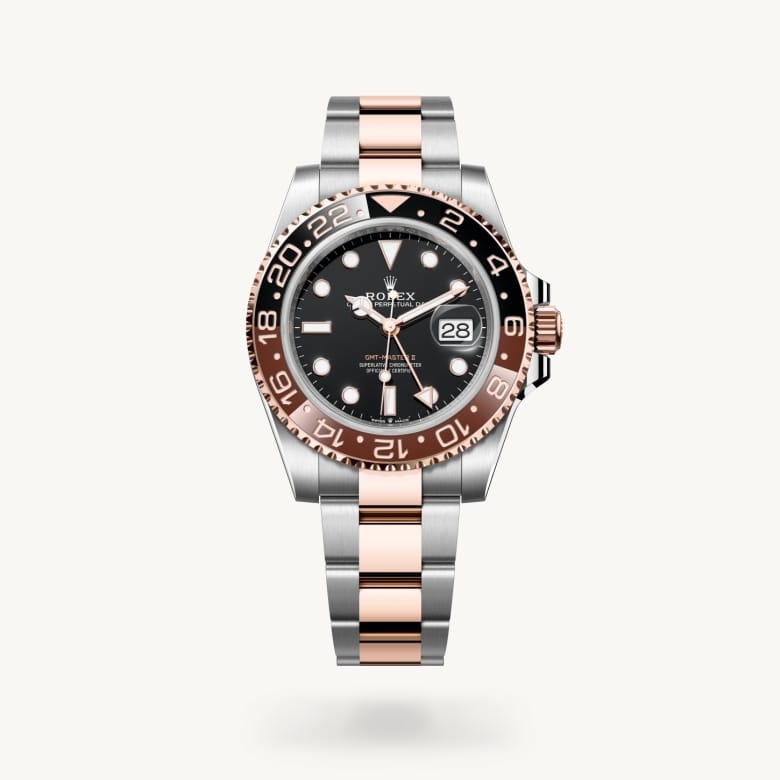 This model features a black dial and a two-colour Cerachrom bezel insert in brown and black ceramic. In addition to conventional hour, minute and seconds hands, the GMT-Master II features an arrow-tipped hand, which circles the dial once every 24 hours, as well as a bidirectional rotatable 24-hour graduated bezel. The distinctively coloured 24-hour hand displays the “home” reference time in a first time zone which can be read on the graduations on the bezel. The traveller’s local time is easily set by “jumping” from hour to hour, thanks to an ingenious mechanism operated via the winding crown: the hour hand can be adjusted forwards or backwards independently of the minute and seconds hands. This allows travellers to adapt to their new time zone without affecting the precision of their timekeeping.