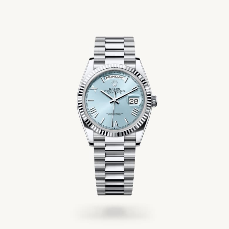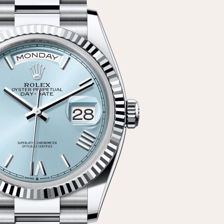 The ice-blue dial is the discreet and exclusive signature of a Rolex platinum watch. Rolex uses platinum, the noblest of metals, for the finest of watches. This exclusive dial colour can be found only on the Day-Date, the Cosmograph Daytona and the Perpetual 1908.