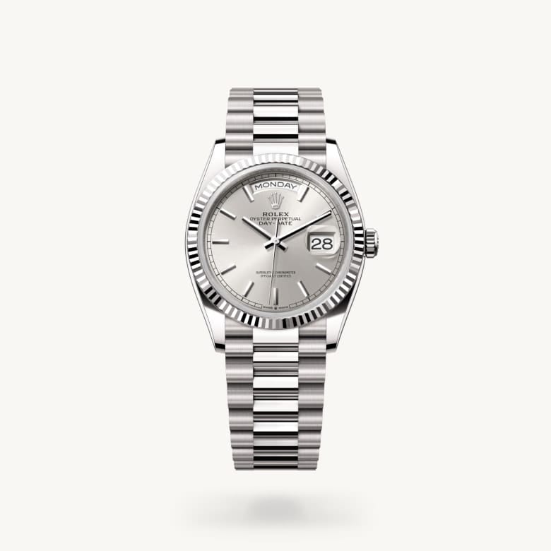 The Rolex fluted bezel is a mark of distinction. Originally, the fluting of the Oyster bezel had a functional purpose: it served to screw the bezel onto the case helping to ensure the waterproofness of the watch. It was therefore identical to the fluting on the case back, which was also screwed onto the case for waterproofness, using specific Rolex tools. Over time, the fluting became an aesthetic element, a genuine Rolex signature feature. Today the fluted bezel is a mark of distinction, in gold on this Day-Date 36.