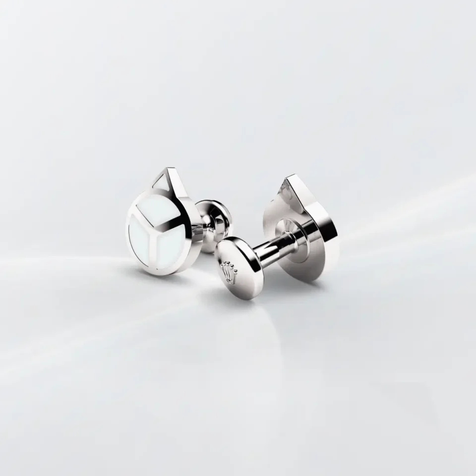Rolex cufflinks made of 18 ct white gold that echo the hour hand found on Professional Rolex watches, equipped with a Chromalight display.