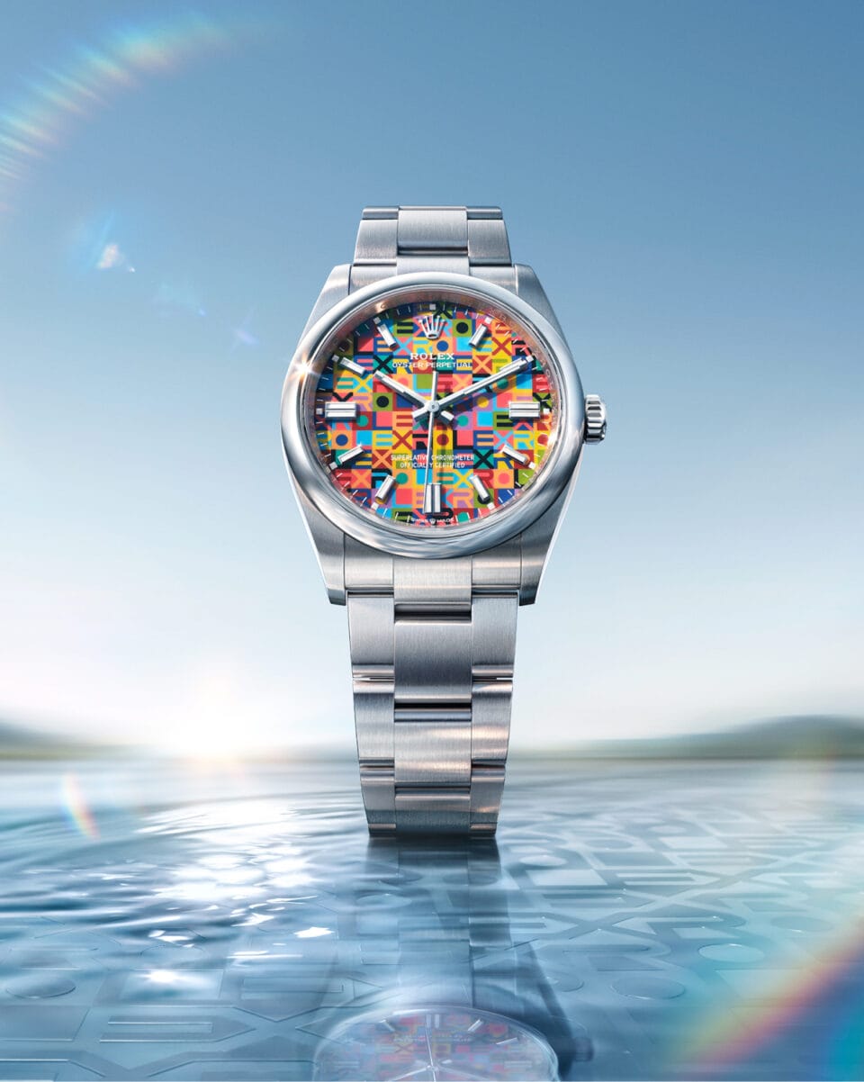Rolex unveils a new version of the Oyster Perpetual 36 in Oystersteel with a dial decorated with a highly graphic and colourful Jubilee motif, displaying the letters of the Rolex name.