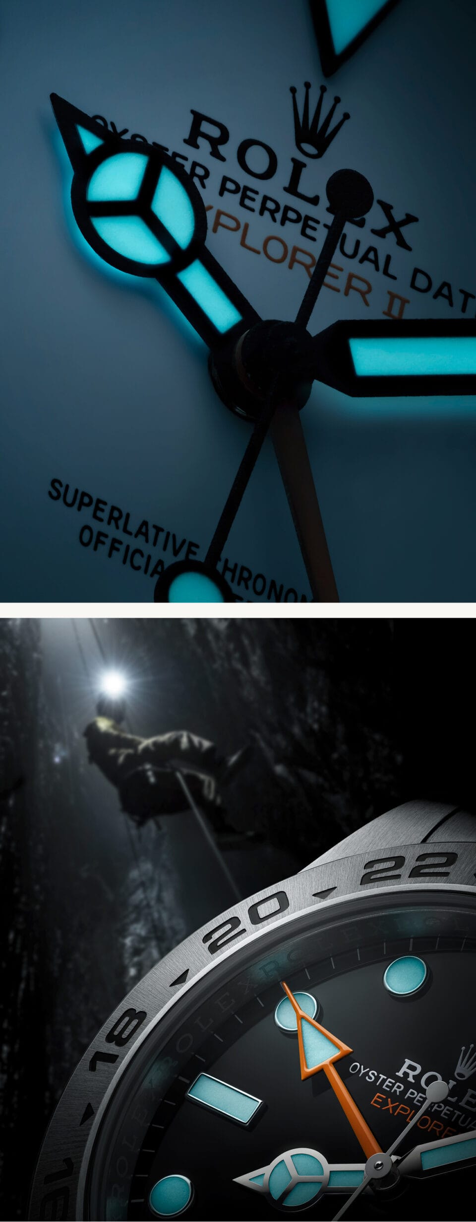 Oyster Perpetual watches accompanied numerous Himalayan expeditions – including the group that Sir Edmund Hillary and Tenzing Norgay Sherpa were part of when they became the first climbers to reach the summit of Everest on 29 May 1953 – and have been worn by explorers venturing to the far corners of the globe, through deserts, at the poles or in the depths of the Earth. In these often harsh and unfamiliar environments, distinguishing day from night can become impossible. For speleologists, who spend days at a time in darkness, or polar expeditions travelling under the midnight sun or through endless night, the Explorer II, with its 24-hour display, is an essential part of their equipment.