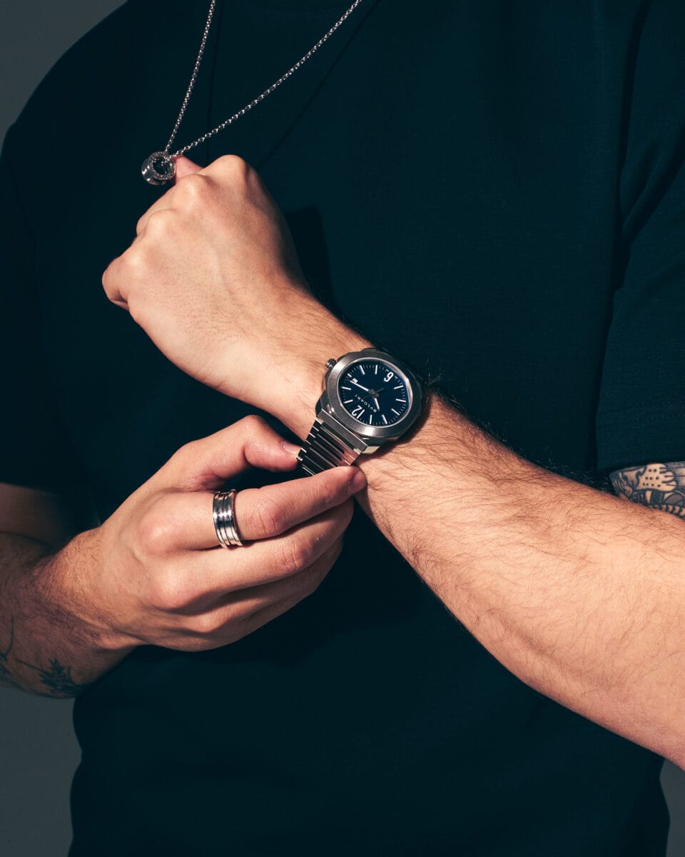 Kellosta irtoava musta aine on likaa. Kuoren korvakkeiden ja rannekkeen sekä lukon pieniin väleihin kerääntyy likaa ajan myötä, mikä on hyvä poistattaa. Lika voi alkaa ärsyttää ihoa, jolloin sitä hyvin usein luullaan metallin aiheuttamaksi allergiaksi.