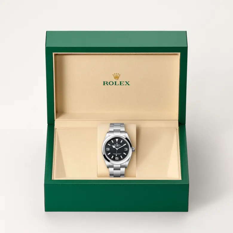 Oyster Perpetual Explorer 36 tuo raikasta eloisuutta puhtaan selkeisiin linjoihin, jotka ovat tehneet mallista ikonisen. Sileä Oystersteel-kehä on vankka mutta tyylikäs, ja se on täydellisessä sopusoinnussa Explorerin ikonisten perinteiden kanssa.