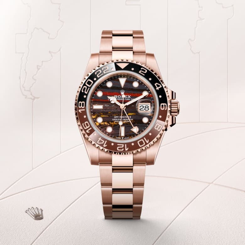Tässä GMT-Master II:ssa on tiikerirautainen kellotaulu. Rolex käyttää tässä kellossa ensimmäistä kertaa tätä metamorfista kivilajia, joka tunnetaan monisyisestä kuvioinnistaan. Tämä kullan ja oranssin sävyissä hehkuva kivilaji on muodostunut kolmesta mineraalista: tiikerinsilmästä, punaisesta jaspiksesta ja hopeanhohtoisesta hematiitista. Kivet valitaan äärimmäisen tarkasti, jotta ne ovat valmiissa kellossa täydellisessä sopusoinnussa kuoren ja rannekkeen sävyjen kanssa.