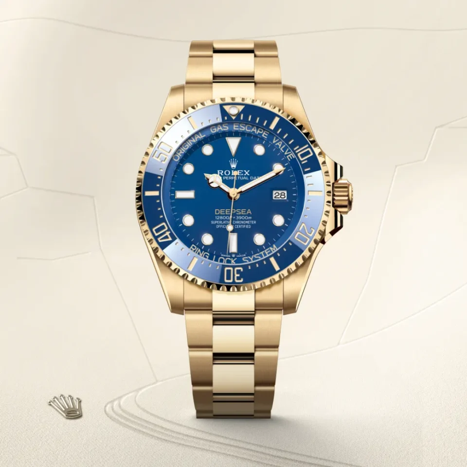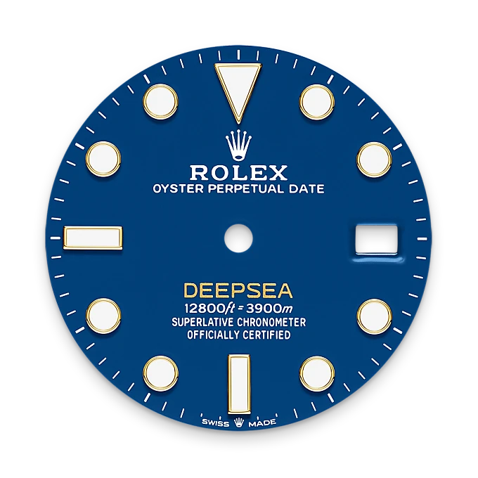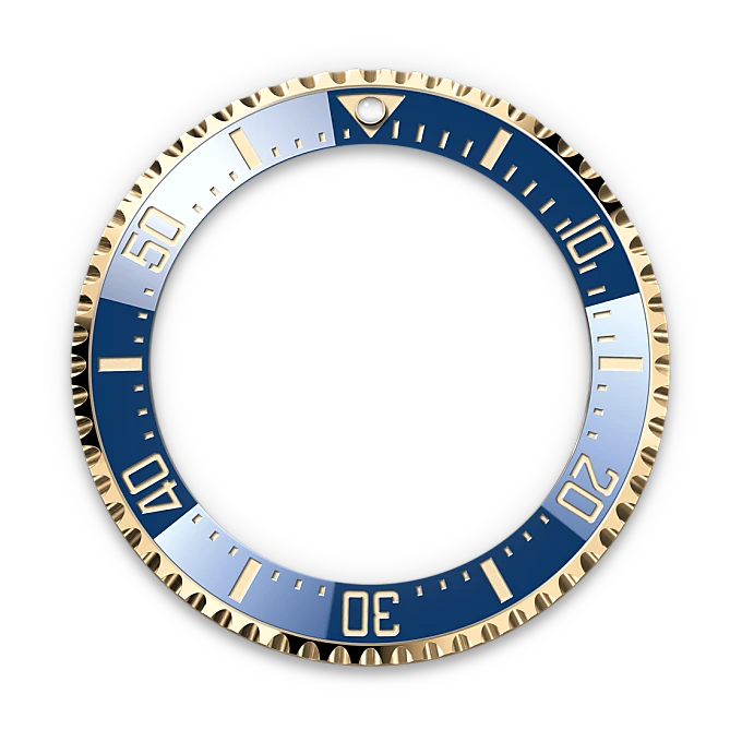 Rolex Deepseassa on 60 minuutin indekseillä varustettu yhteen suuntaan kierrettävä kehä, jonka avulla sukeltajat voivat tarkasti ja turvallisesti seurata sukellus- ja dekompressioaikoja. Kolmionmuotoinen nollaindeksi näkyy pimeässä, sillä siihen on integroitu kapseli, joka on täytetty pitkään hohtavalla sinisellä lumeella. Kehän indeksit on pinnoitettu PVD-menetelmän avulla ohuella keltakultakerroksella. Kompressiorenkaan, kellotaulun ja Cerachrom-kehäinsertin siniset sävyt yhdistyvät hillityksi merelliseksi paletiksi, jota kuoren ja Oyster-rannekkeen 18k keltakulta korostaa.