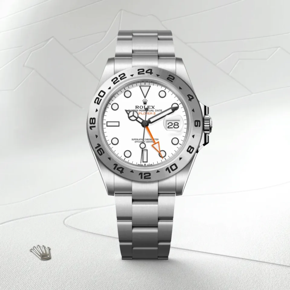 Explorer II:ssa on päivämäärän näyttö, oranssi 24 tunnin lisäosoitin sekä 24 tunnin indekseillä varustettu kiinteä kehä, minkä ansiosta päivä on helppo erottaa yöstä. Tämä kello on luola- ja tulivuoritutkijoiden sekä naparetkeilijöiden suosikki. Sen tunti-indekseissä ja osoittimissa on helppolukuinen Chromalight-näyttö pitkään näkyvällä sinisellä lumeella.
