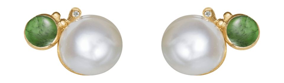 Charlotte Lynggaardin suunnittelemat BoHo-nappikorvakorut on valmistettu 18 karaatin keltakullasta ja niissä on kaksi makeanveden helmeä, kumpikin noin 10-11mm, kaksi 6mm:n vihreää turmaliinia ja kaksi timanttia 0,02ct TW.VS. Jokaisessa korvakorussa on kaksi silmukkaa riipuksia varten. Myydään pareittain. Osa BoHo-kokoelmaa.