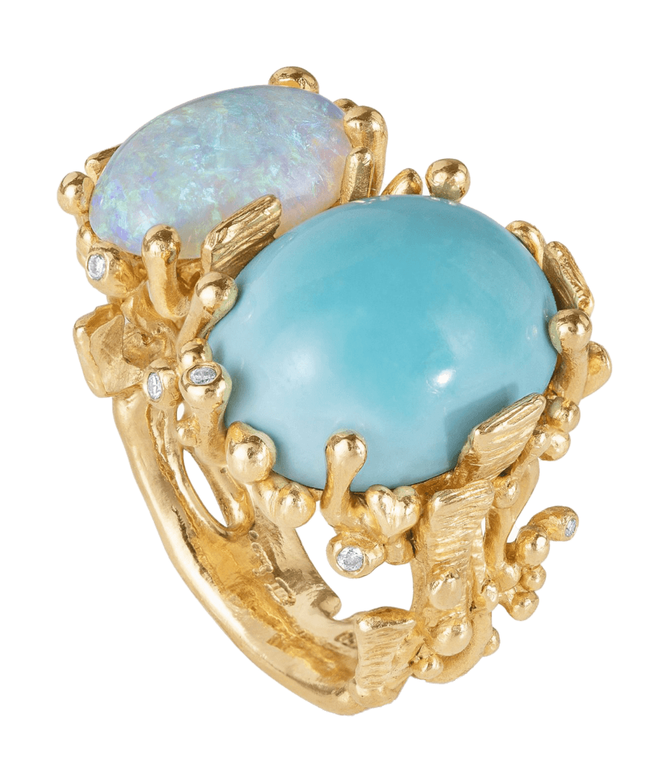 Charlotte Lynggaardin suunnittelema BoHo-sormus on valmistettu 18 karaatin keltakullasta, jossa on 14,3 karaatin, 18 x 13mm turkoosi, 2,5 karaatin, 13 x 9mm vaaleansininen opaali ja 7 timanttia 0,05ct TW.VS. Muotoillut ja kiillotetut kultapinnat ovat kultaseppien käsin viimeistelemiä. Osa BoHo-kokoelmaa.