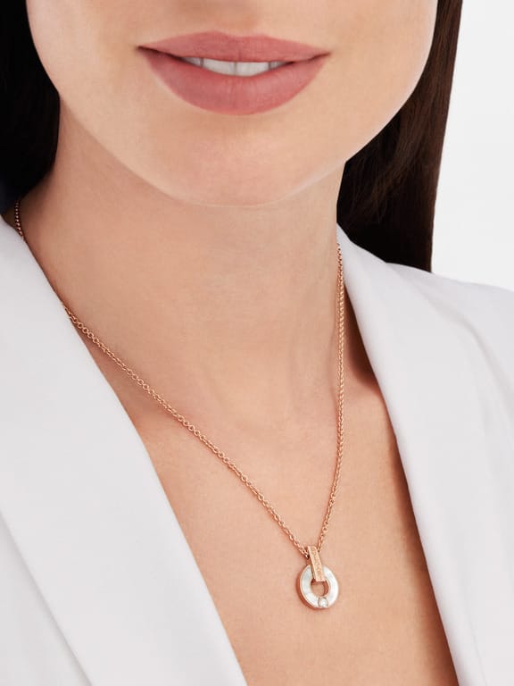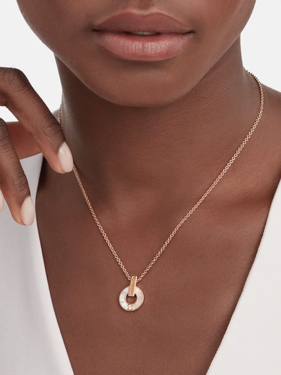 Tyylikäs kaulkoru on valmistettu 18 karaatin punakullasta ja sitä koristaa valkoisen sävyinen helmiäinen ja 0,06ct timantti.