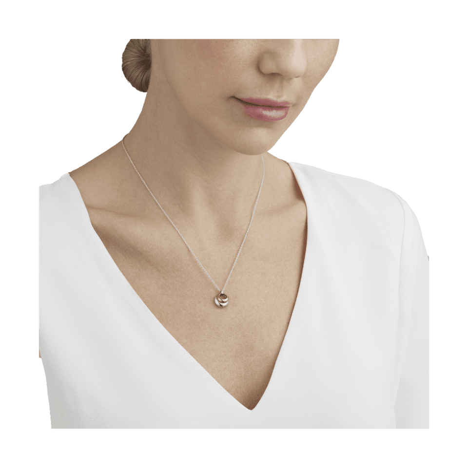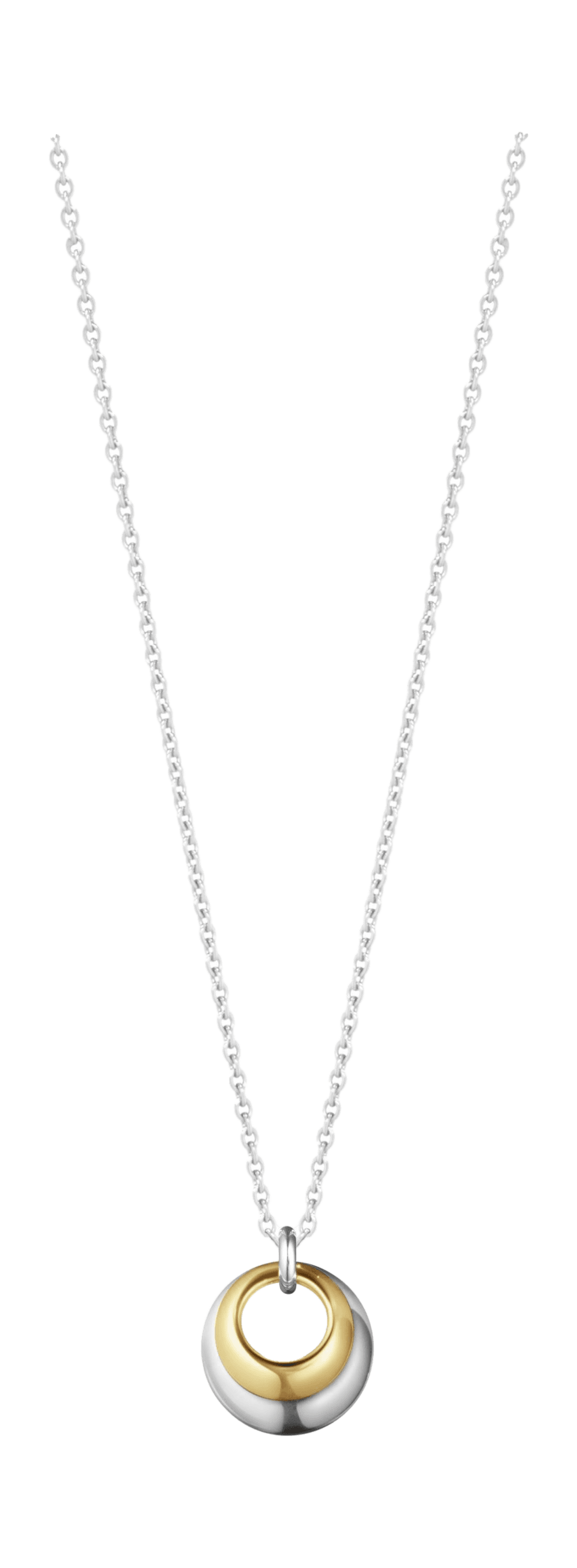 Kaksi erillistä, täydellisessä mittasuhteessa olevaa rengasta – toinen hopeinen ja toinen keltakultainen – asettuvat päällekkäin ja luovat tämän katseenvangitsevan kaulakorun. Epätavallinen sekoitus jalometallia, kun kaksi osaa roikkuvat yhdessä, antaa kaulakorulle ilmeen, joka vetoaa naiseen, jolla on yksilöllinen tyylitaju.