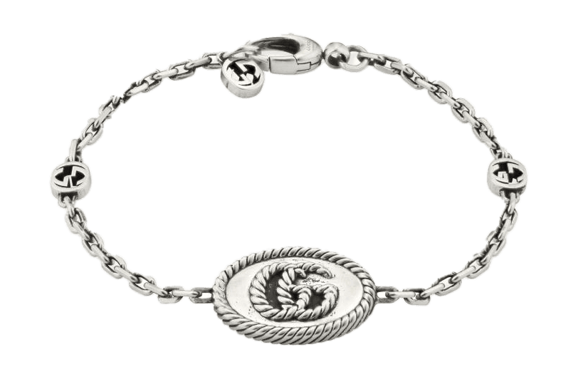 Tässä Guccin rannekorussa on ikääntynyt viimestely sekä Double G symboli. Korussa on sopiva sekoitus nykyaikaisuutta ja klassisuutta.