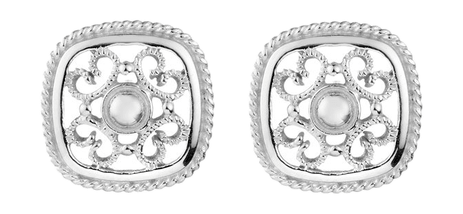 Korvakorujen pitsimäinen filigraanikuvio on saanut innoituksensa kultaisesta sormuksesta, joka on peräisin 1700-luvulta. 14 karaatin valkokulta. Tappikiinnitys.