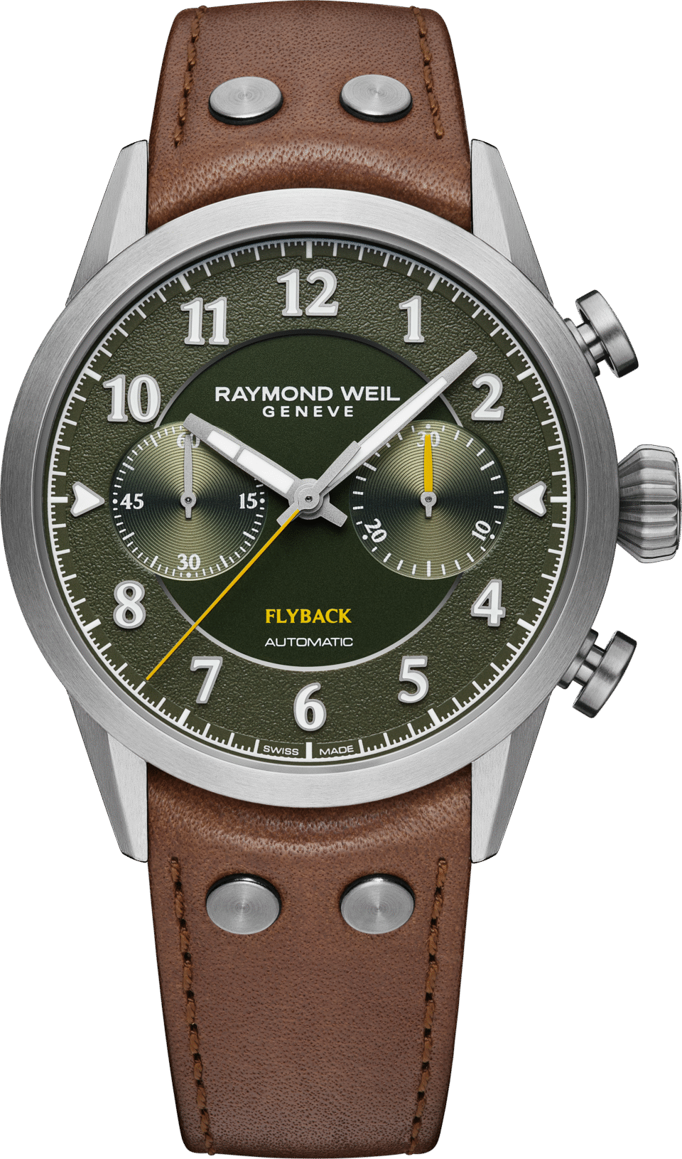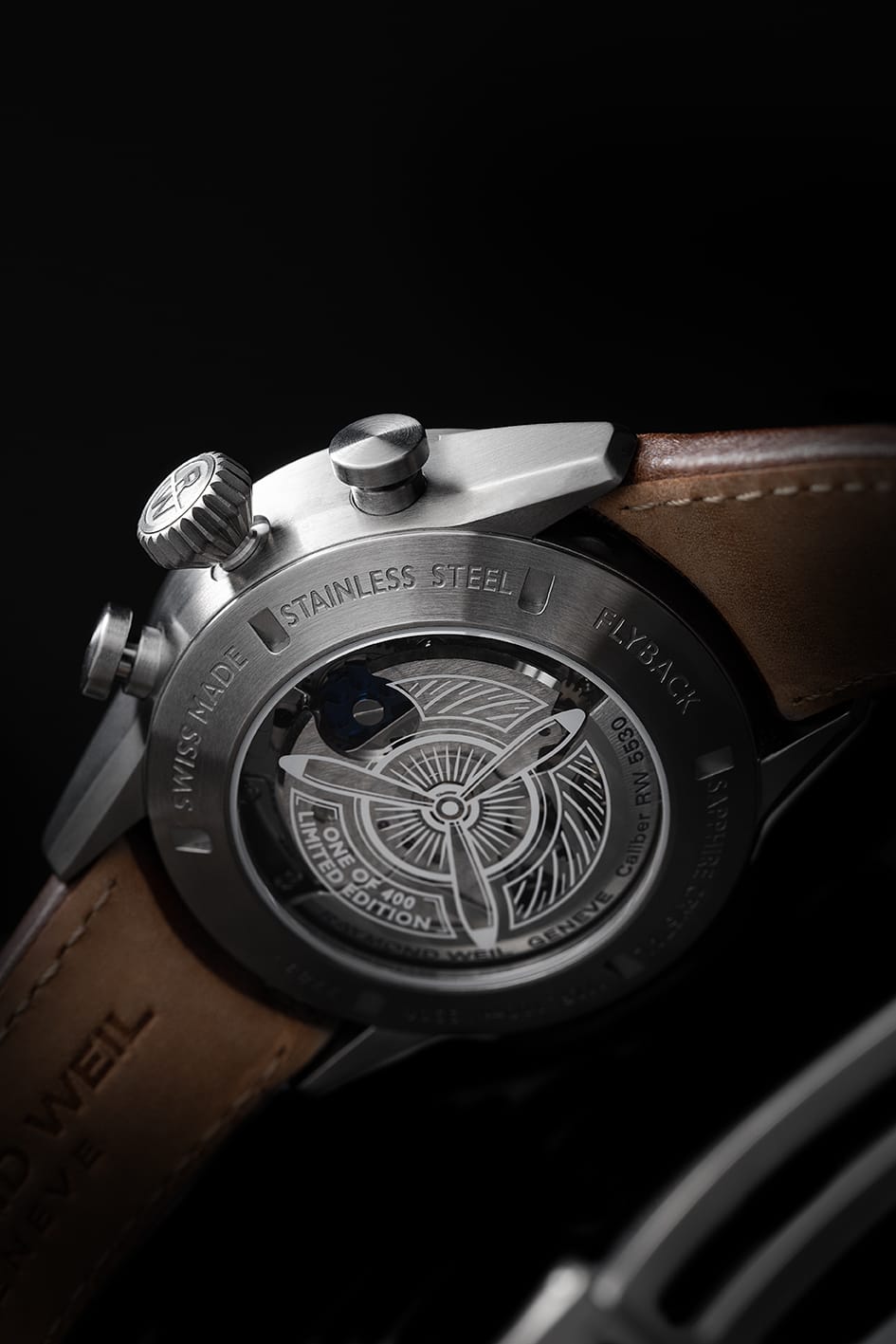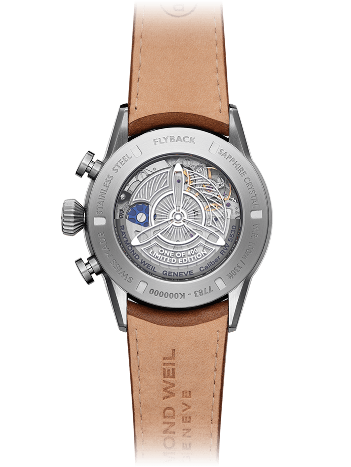 Freelancer Pilot Flyback Chronograph Limited Edition ”One of 400” juhlistaa brändin perintöä kunnioittamalla herra Raymond Weilin intohimoa ilmailuun. Tässä kellossa on myös brändin uusi ja monimutkainen komplikaatio, flyback-kronografi. Monien lentäjien käyttämä flyback-toiminto mahdollistaa etäisyyksien tarkan laskemisen lennonvarmistuksen aikana.