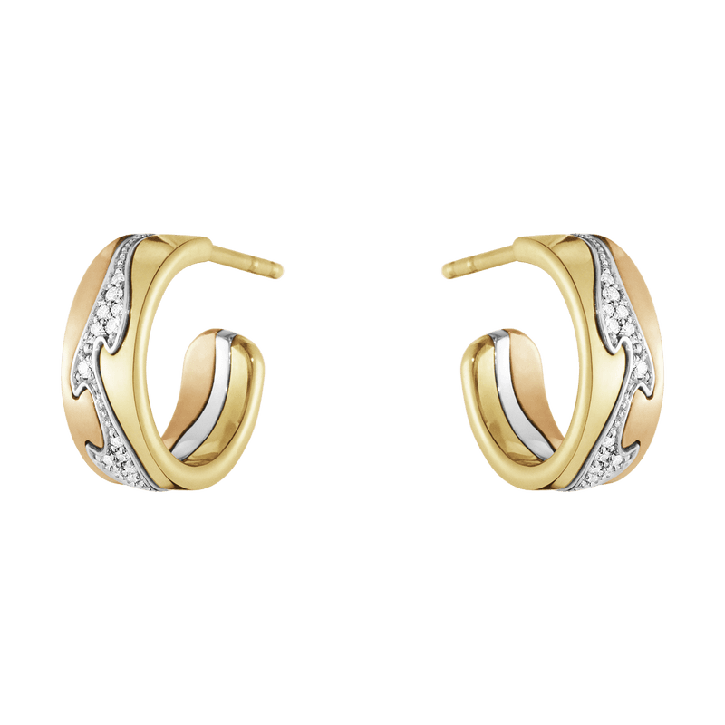 Nämä pienet korvarenkaat, joissa on Fusion-kokoelman ikoninen kuvio, on valmistettu 18 karaatin keltakullasta ja koristeltu briljantti-hiotuilla timanteilla.