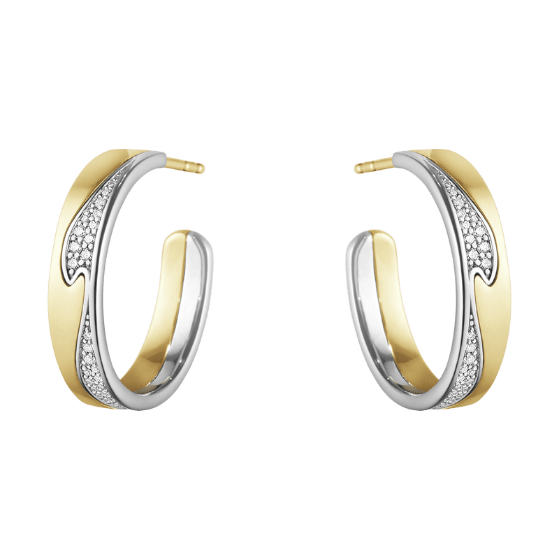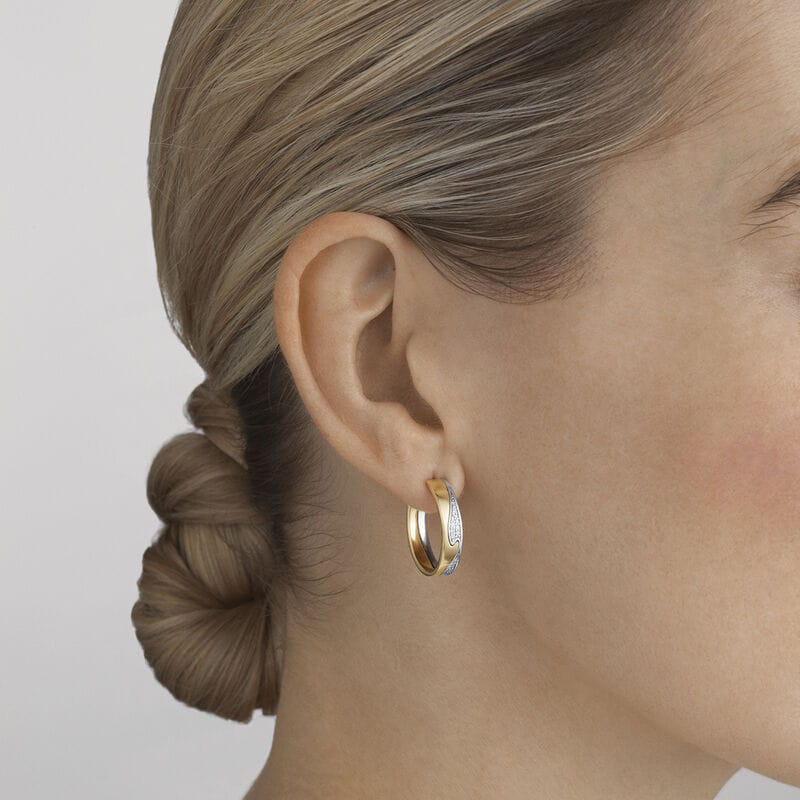 Kaksi eri elementtiä – 18K keltakulta ja valkokulta, jossa on timantteja – yhdistyvät orgaanisesti muodostaen täydellisen muodon. Kerro tarinasi rakkaudestasi suurilla korvarenkailla, jotka ovat täydellinen lahja elämäsi erityiselle naiselle.