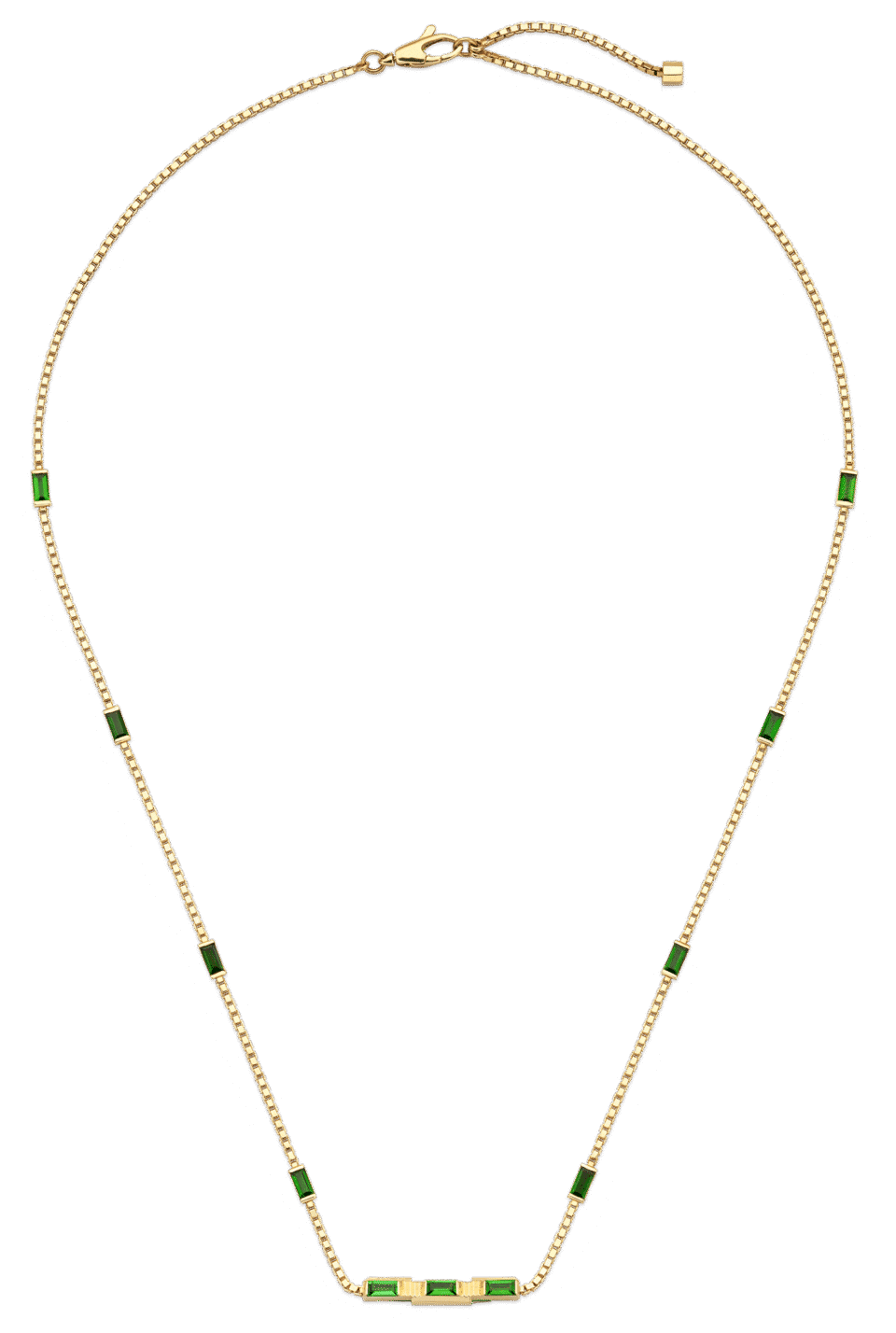 Gucci Link to Love -kokoelma on täynnä modernia romantiikkaa ja rakkauden symboleja. Mallistossa on nähtävillä erilaisia viimeistelyjä kullan eri sävyjen kanssa. Jokaisen kappaleen on tarkoitus inspiroida yksilöitä käyttämään niitä itsekseen tai yhdistämällä niitä. Tässä 18k keltakultaisessa kaulakorussa on yksityiskohtina vihreä turmaliini.