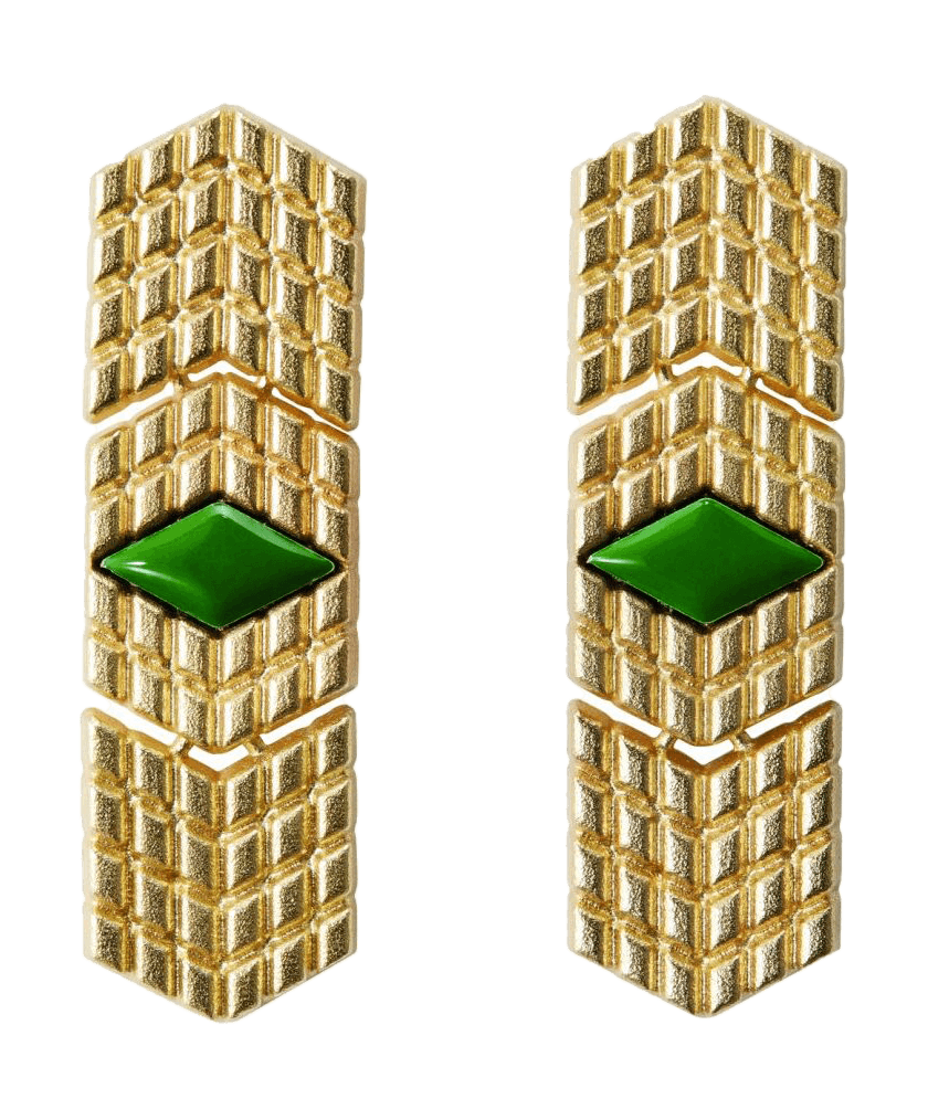 Kullanhohtoisesta pronssista tehdyissä juhlavissa korvakoruissa loistavat rombin muotoiset emaloidut hopealevyt. Emaliosat on valmistanut Pauliina Rundgren omalla studiollaan Mikkelissä. Korvakorujen hienostunut pintarakenne tuo mieleen kaarnan ja kävyt, ja vaikutelmaa korostaa emalin syvä metsänvihreä hehku. Tappikiinnitys, tapit ja taustanastat hopeaa.