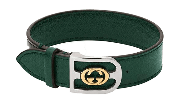 Vihreä, nahkainen interlocking rannekoru. Taittolukollinen solki on valmistettu teräksestä ja sitä koristaa keltakultainen interlocking monogrammi. Pituus säädettävissä.