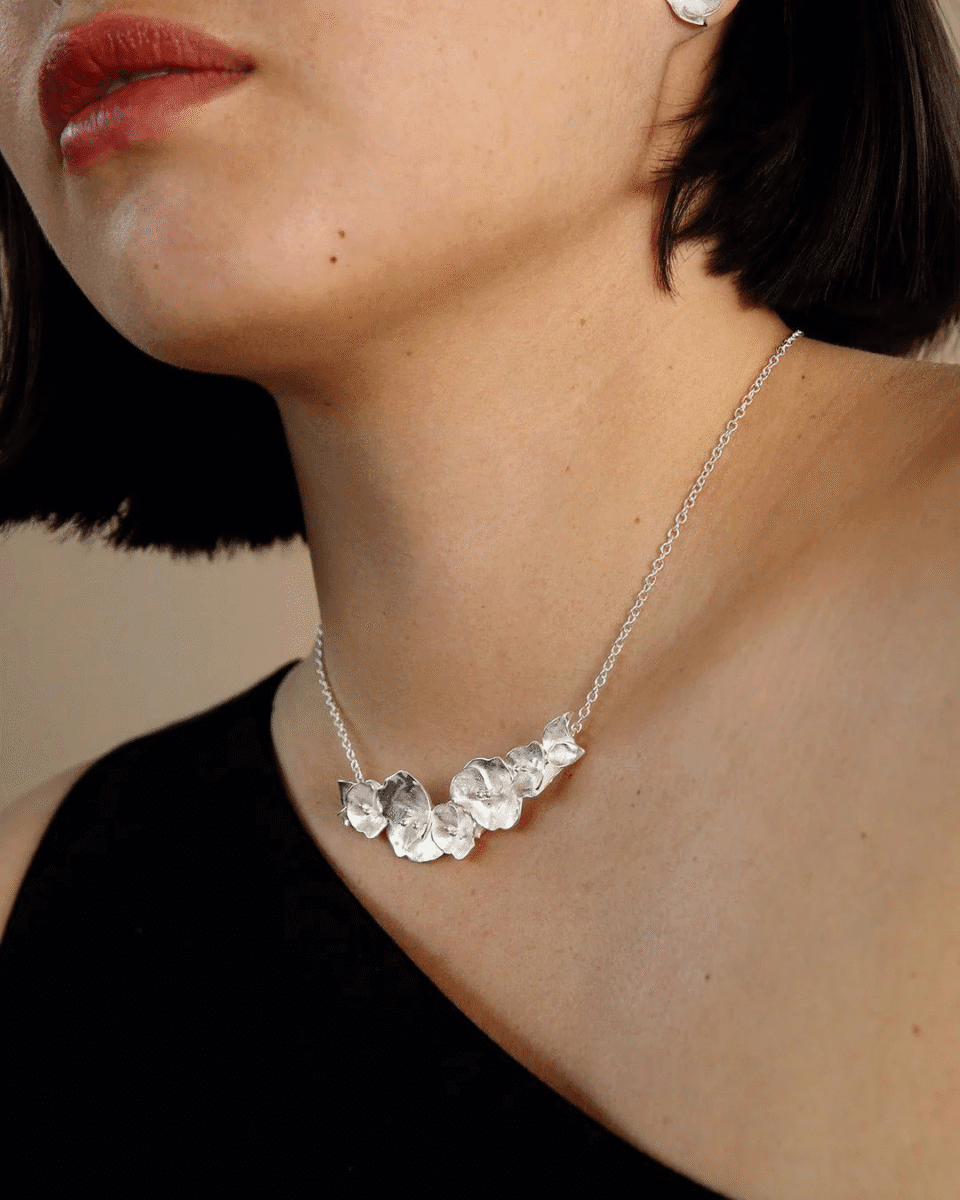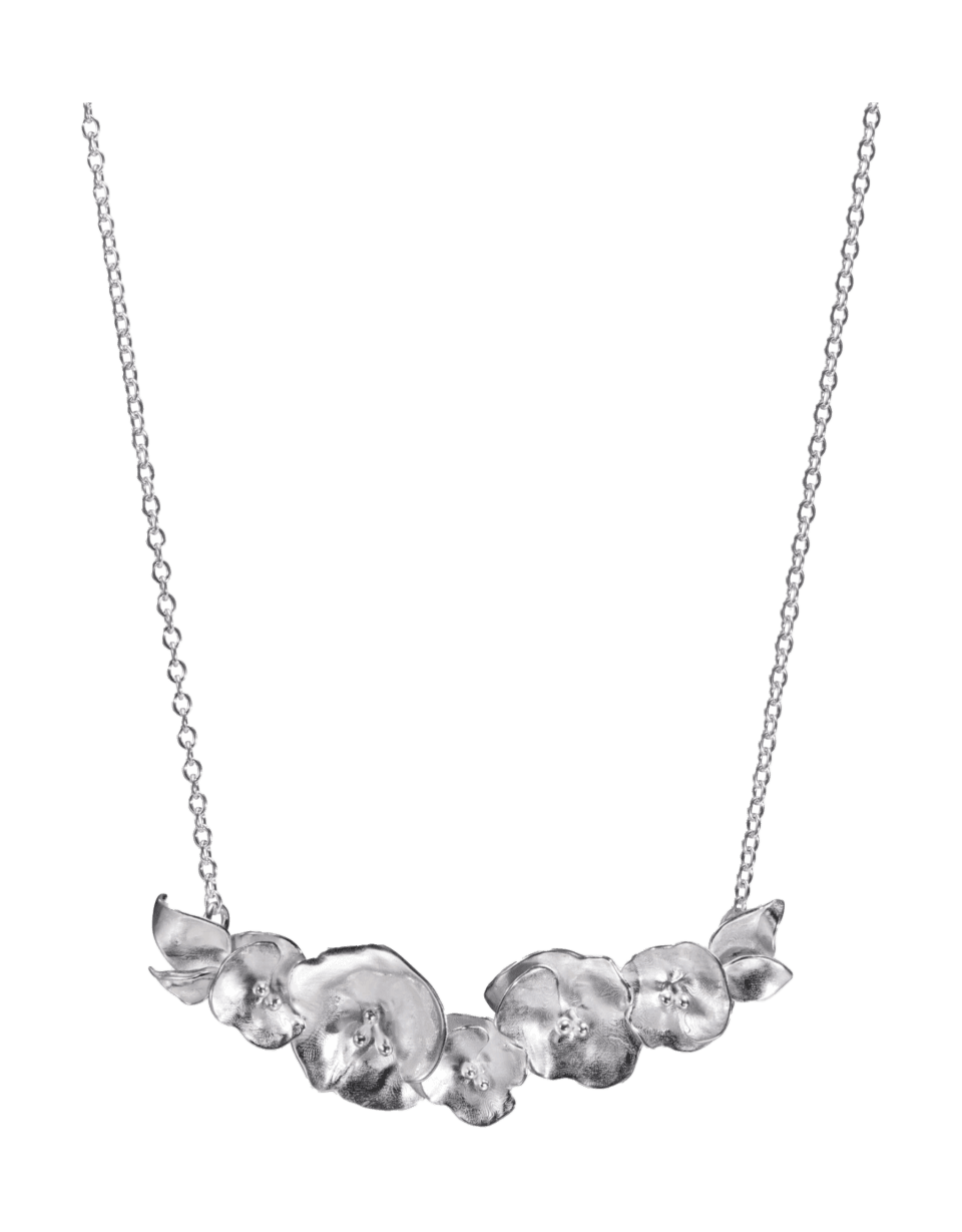 Juhannusruusujen herkkä kauneus puhkeaa kukkaan hopeisissa Kesäyön ruusu -koruissa. Veistoksellinen Kesäyön ruusu -kaulakoru on kuin eläväinen ruusuköynnös, joka houkuttelee tulemaan lähelle ja katsomaan tarkasti. Ankkuriketju, säädettävä pituus 40/42/45/50 cm. Jousirengaslukko. Valmistettu käsityönä.